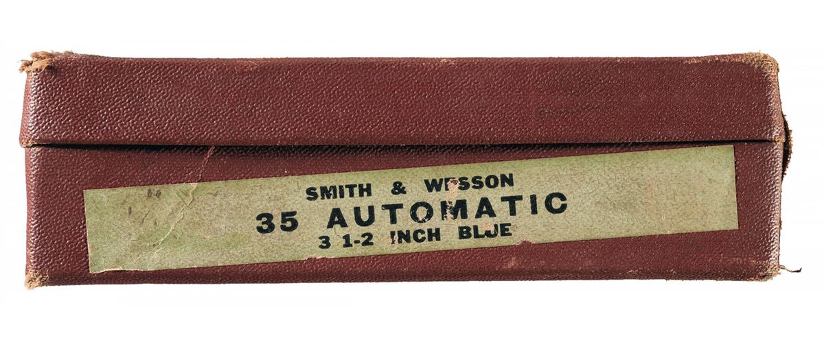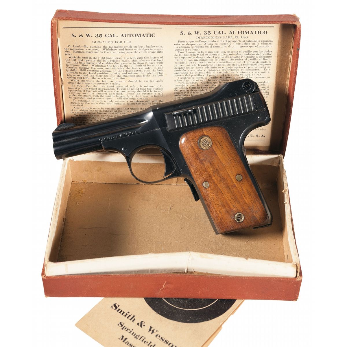 Manufactured from 1913 to 1921. The top of the receiver is marked with the three-line address/patent information and "SMITH & WESSON" is marked on the left side of the barrel with the right side marked "35 S.&W. AUTO. CTG". Fixed sights, grip safety and smooth walnut grips with Smith & Wesson medallions. Complete with the factory box with the correct green end label and English and Spanish direction label on the inside of the lid.