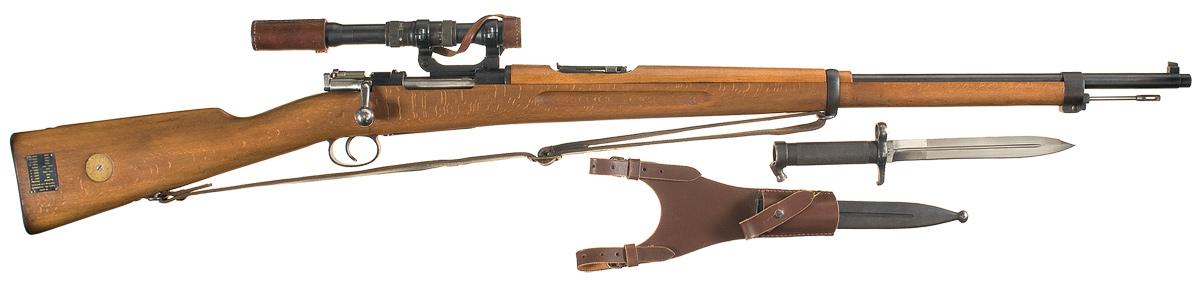 This is an excellent example of an earlier production Model 1896 sniper rifle as manufactured by the Carl Gustav factory that was fitted with a short rail type M/42 scope. The top of the receiver is marked with a large "Crown C / CARL GUSTAFS STADS / GEVARSFAKTORI / 1902". The number "131" and a crown proof are visible on most parts. The rifle is equipped with a semi-hooded front sight and adjustable rear tangent style sight graduated from 3 to 6. The scope is mounted on a short rail system on the left receiver wall and the scope is a 42 AGA 3x65 variation with leather lens caps. It has the full length military stock and short handguard with the brass Torped Overslog Str. Disk and range calculation plaque on the right side, and crown proofs on the wrist. Complete with slotted cleaning rod, leather sling and Swedish Mauser bayonet with metal scabbard and leather frog.