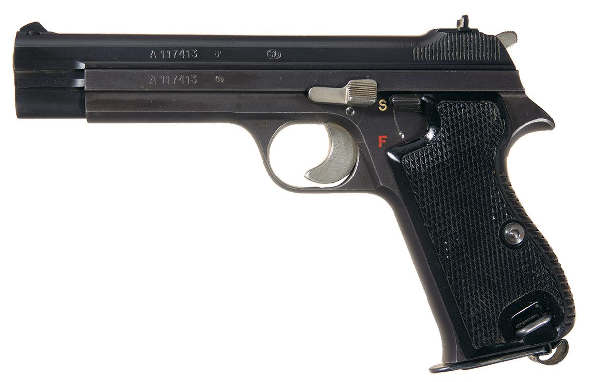 This Swiss Army SIG P210-2 pistol features the Geneva Cross and Shield stamped on top of the frame of the rear sight. The top of the slide has a grooved sighting panel between the chamber and the front sight. The pistol has the correct low luster blue finish on the slide and a matte black phosphate finish on the frame. The two-piece black plastic grips have checkered panels on the sides and serrations on the back. The pistol has fixed front and rear sights, magazine release on the heel of the grip and lanyard loop on the lower left side of the frame. One 8-shot magazine with a blued finish. The left side of the slide is roll-marked with the serial number (the "A" designates this pistol as property of the Swiss Army) followed by proofmarks and "SIG" in an oval. The left side of the frame is roll-marked with the serial number followed by a proof or inspection mark. A "P" is stamped on the left side of the trigger guard bow. The "S" (Safe) marking on the right side of the frame is filled with white paint and the "F" marking below it is filled with red paint. The barrel is finished bright and the serial number (without the "A" prefix) and a proofmark are etched on the chamber. The pistol is complete with a Swiss Army russet, cow-hide, full-flap holster with integral magazine pouch and has two belt loops on the back. The holster is stamped "HANS WIRZ / 1952 / GELTERKINDEN" on the back.