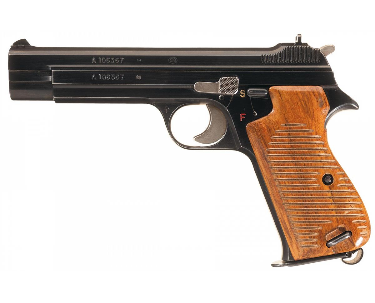 Introduced in 1949, the P210 remains in service with the Swiss and Danish militaries. Fixed sights with the Swiss "cross in shield" stamp on the rear sight base. Stacked matching serial numbers on the left side of the slide and frame, matching number on the barrel, "SIG" makers mark on the slide and "P" on the left side of the trigger guard. Fitted with a manual safety, magazine well safety, checkered slide catch, heel-mounted magazine catch and serrated grips.
