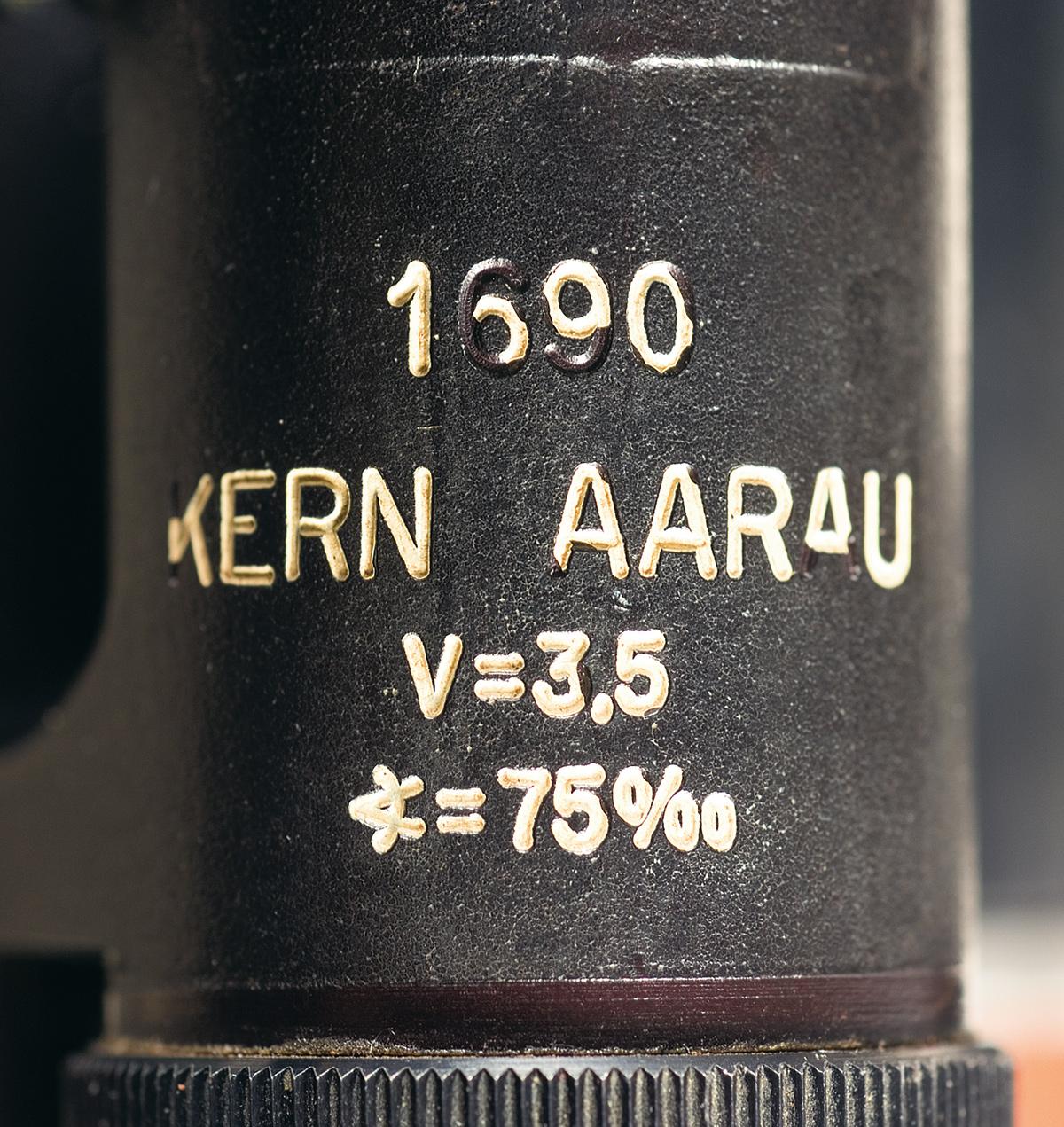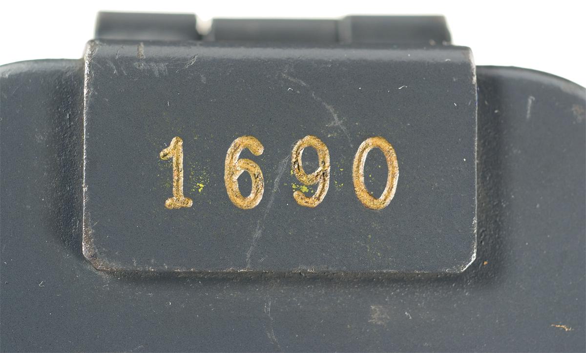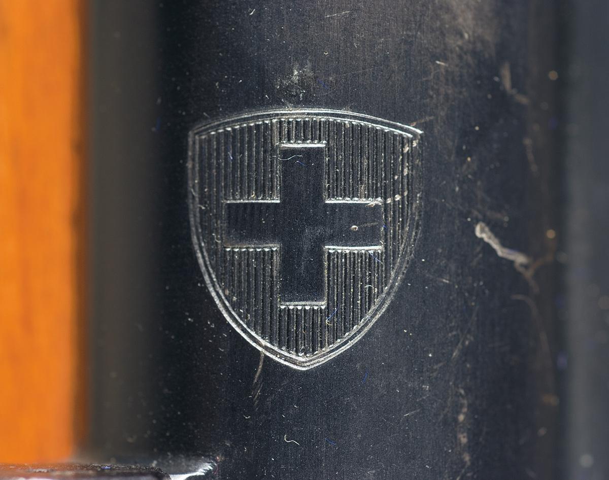 This model was introduced in 1955 and is built on the Model 31 action and is fitted with a 25 3/4 inch barrel which is fitted with a muzzle break and bayonet lug. The top of the chamber is marked with the Swiss cross and the matching serial number is marked on the breech end of the barrel, left side of the frame, bottom of the magazine, and on the bolt. The rifle is equipped with a 3.5 power Kern Aarau sniper scope which is numbered to the gun. The top of the scope is marked "1690 / KERN AARAU / V=3.5 / star =75 0/00". The left side of the receiver has integral bases and the scope and mounting rail are all one piece. The front sight is a shrouded blade and the rear sight is the tangent style graduated to 1,500 meters. There is an integral folding bipod mounted about mid stock, ahead of the magazine. Mounted with a one piece Beech pistol grip stock with checkered grip area, forearm finger grooves, steel buttplate and matching handguard. Complete with a correct leather sling and gray painted scope tin correctly numbered to the gun. The barrel is imported marked.