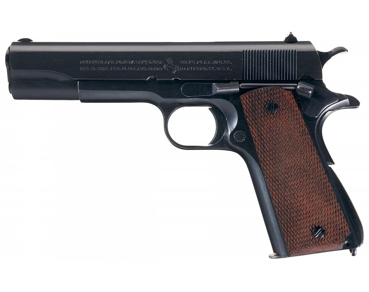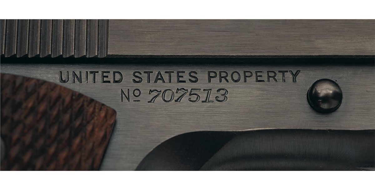 Developed in 1923 on orders from the Ordnance Department, the Improved Model 1911 pistols were equipped with a shorter trigger, dished out receiver sides, extended grip safety, arched mainspring housing and widened front sight, essentially making them the first government contract pistols to conform to the 1911A1 standard. This particular model comes with a factory letter, identifying it as part of a 2,998 pistol delivery made to the Springfield Armory on July 25, 1924, with the letter explicitly calling it a "Transition Model" and calling out the "new style" trigger, safety and mainspring housing. Fixed sights, with the two line, two block address and patent dates on the left side, divided by the Rampant Colt, and "MODEL OF 1911.U.S.ARMY" on the right. Captain Walter T. Gordon's "WTG" inspection mark on the left side of the frame, with "60" on the trigger guard and "UNITED STATES PROPERTY" on the right side. Equipped with a Colt barrel (conjoined "HP" stamp), checkered wide hammer, slide catch, thumb safety, trigger and mainspring housing, checkered grips and a two-tone magazine.