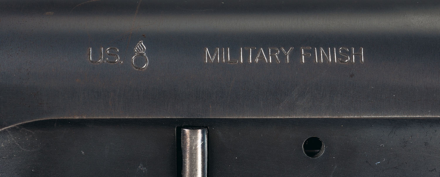 This is a very nice and desirable WWII riot shotgun that was manufactured under contract by Remington Arms for the US Army. This is the later pattern with the receiver marked "MILITARY FINISH" on the upper left side of the receiver behind "U.S. ordnance bomb". The standard Remington marking over the serial number are marked in the center at the bottom. The top of the barrel is marked "REMINGTON ARMS CO. INC. ILION NY. MADE IN U.S.A." over the Browning patent markings and numbers followed by "U.S. ordnance bomb". The left side of the barrel is marked "12GA FOR 2-3/4 OR SHORTER SHELLS". The left side at the breech is marked "CYL" and "KLX" and the right is marked with the "R.E.P." in an oval and a diamond. The stock and forend are smooth walnut and the left side of the buttstock has the Cross Cannon Ordnance cartouche and the unboxed "FJA" cartouche of the US inspector and brown hard plastic Remington buttplate.