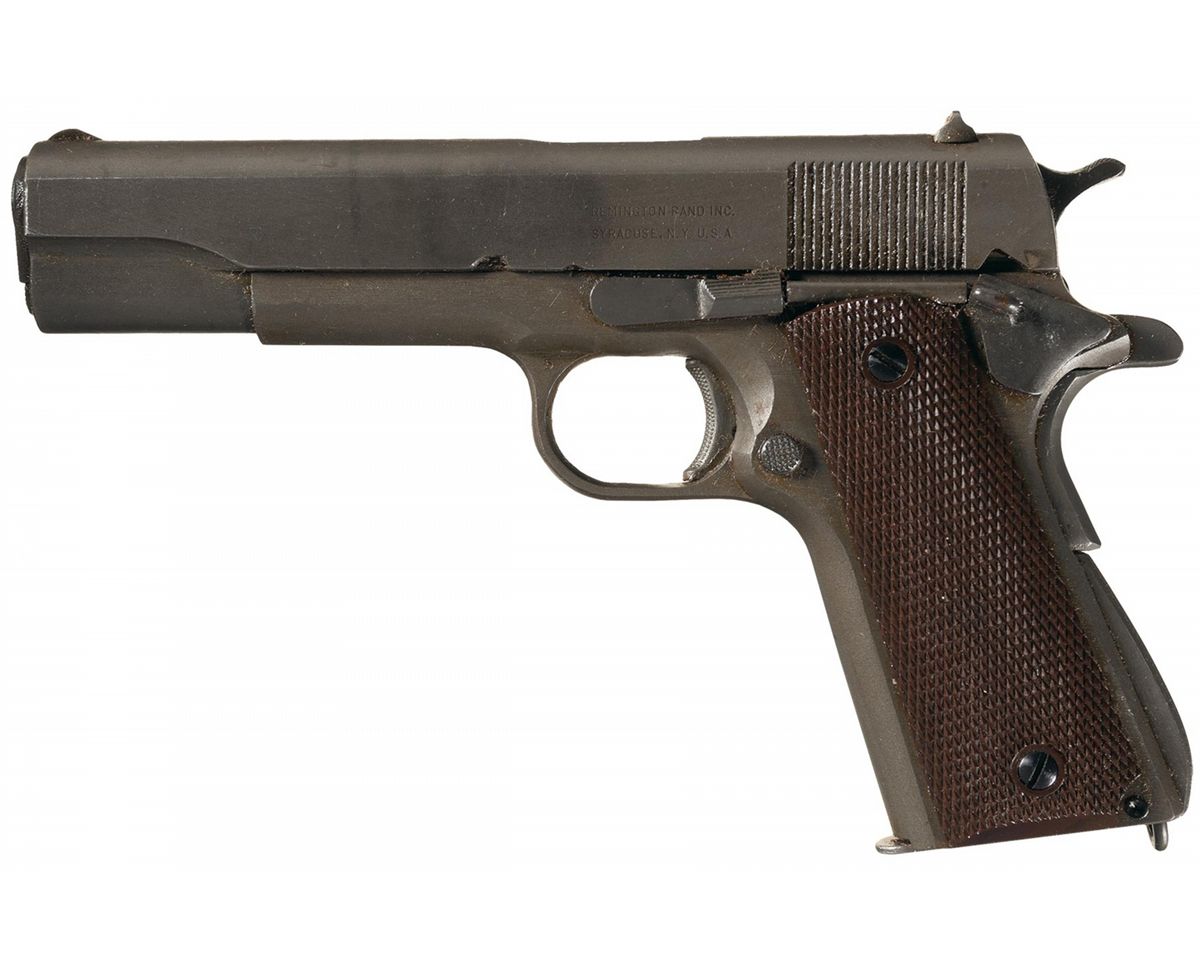 Made in 1945. Fixed sights, with "REMINGTON RAND INC./SYRACUSE, N.Y. U.S.A." and "P" on the slide, Atwood inspected frame with "NO." style serial number marking, stamped trigger, thin hammer, serrated mainspring housing, checkered safety, unmarked parkerized magazine and Keyes Fiber grips.