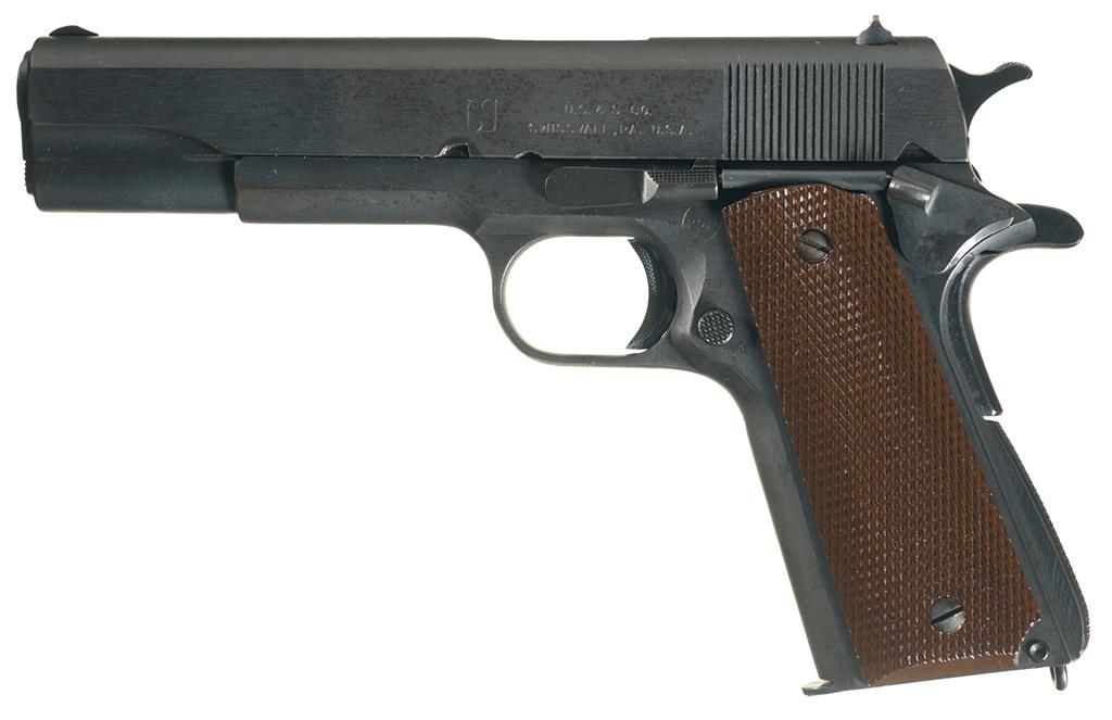 Manufactured in 1943. Fixed sights, with the left side of the slide marked with the intertwined "USS" company logo and "U.S. & S. CO./SWISSVALE, PA. U.S.A." and a "P" stamp ahead of the rear sight and offset to the left. LTC Robert Downie's "RCD" proof is on the left side of the frame over another "P", with a thin hammer, stamped trigger, checkered slide catch, thumb safety and arched mainspring housing, Keyes-Fiber grips (internally ribbed, but without screw reinforcement), full blue "R" magazine and a High Standard barrel.