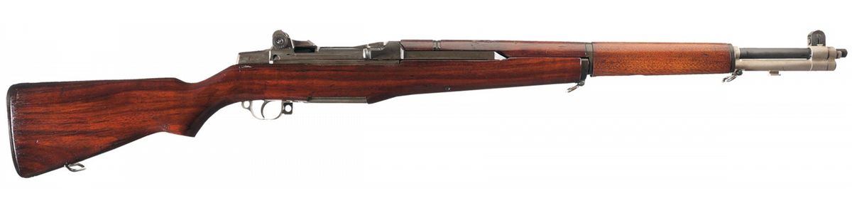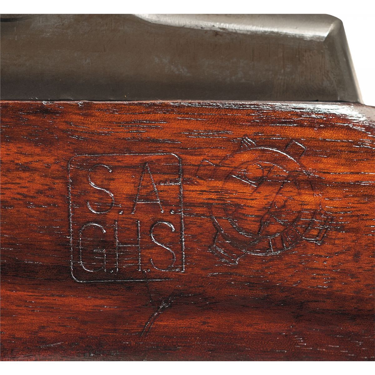 The receiver was manufactured in October 1941 with the barrel marked upside down "S-A-10-41". The barrel also has British proof marks and "X30/06" marked right side up. These markings indicate that this rifle was probably sent to Britain as part of the Lend-Lease program. Standard front sight with anti-tamper button and standard rear sight with a checkered elevation drum marked "BATTLE RANGE" and an unmarked windage drum. Mounted on a smooth walnut pistol grip stock with a boxed "S.A./G.H.S." cartouche, ordnance wheel cartouche and a circled "P" proof.