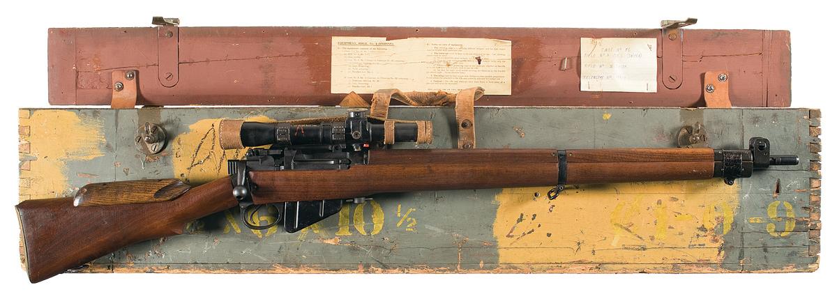 This is an excellent example of a late WWII production British Enfield No 4 MK 1 (T) sniper rifle that is complete with the wooden storage/carrying case. These rifles were the standard British sniper rifle developed in the late 1930s and used until the early 1960s. The left side of the receiver ring is marked with a "crown / BNP" proofmark. The left side of the butt socket is marked "M47C / ENGLAND/ 1945 / U34138 / TR". The rifle is fitted with the correct, but unmatching, No 32 Mk3 scope that is marked on top of the tube "TEL. STG. No 32 Mk.3 / O.S. 2039 A. / intertwined CTH No25582 / broad arrow" and a blue painted "B". The mount marked"D7411" and the rings numbered "M291" on the front and "M292" on the rear. The rifle has the standard blade front sight and tangent military rear sight. It is fitted with the correct wartime smooth semi-pistol grip stock and full handguard with the standard and correct screw on cheekpiece and proofmarks and is correctly stamped "S51" directly behind the pistol grip area with the steel buttplate with butt trap compartment. This rifle is a No. 4 MKI rifle that was selected for accuracy during production and shipped to Holland & Holland for conversion to sniper configuration. The gunsmiths at Holland & Holland carefully bedded the rifle barrel for maximum accuracy, fitted a cheekpiece on the stock, modified the rear sight, installed mounting blocks on the left side of the receiver and fitted the rifle with a No. 32 Telescopic Sight. The No. 4 MKI (T) is generally considered to be the most accurate and rugged sniper rifle issued by any army during WWII. The underside of the stock is stamped with the H&H conversion code "S51".The rifle is complete with an original leather sling and correct leather scope covers. The rig is complete with the correct wartime green wooden storage/shipping container.