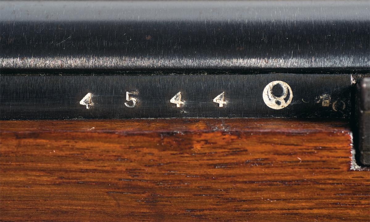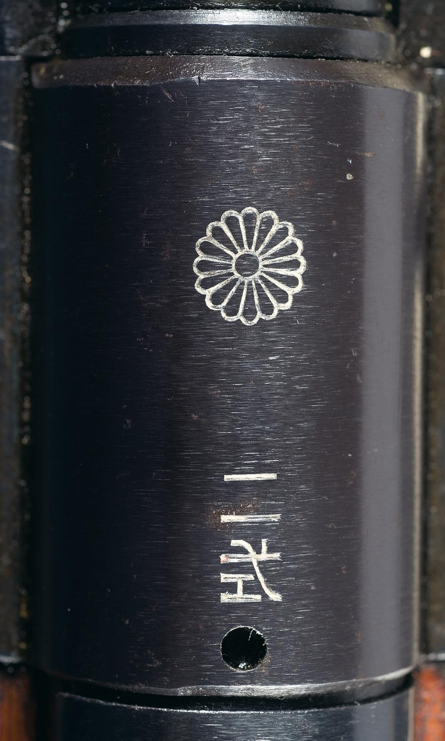This is a mid production Type 2 Paratrooper as manufactured at the Nagoya Arsenal with production starting in 1943. It still retains the Chrysanthemum and Kanji marking on top of the receiver, with the serial number and Nagoya arsenal proof on the left side of the receiver and a matching numbered dust cover. It has the military style tangent rear sight graduated to 1500 meters with the anti-aircraft wings and the inverted "V" front sight with guards. In addition to the standard markings, both the front and rear section of the takedown have a matching assembly number "402" and the underside of the barrel lug is marked "544" which corresponds to the serial number. It has a smooth mahogany stock, with full length hand guard and drain hole ahead of the take down mechanism. There are small Kanji markings present on the underside of the stock below the pistol grip. It is fitted with the side mounted sling swivels and a cupped metal butt plate.