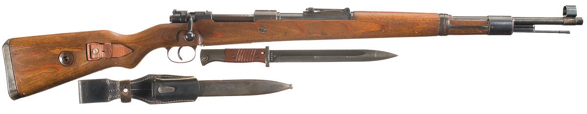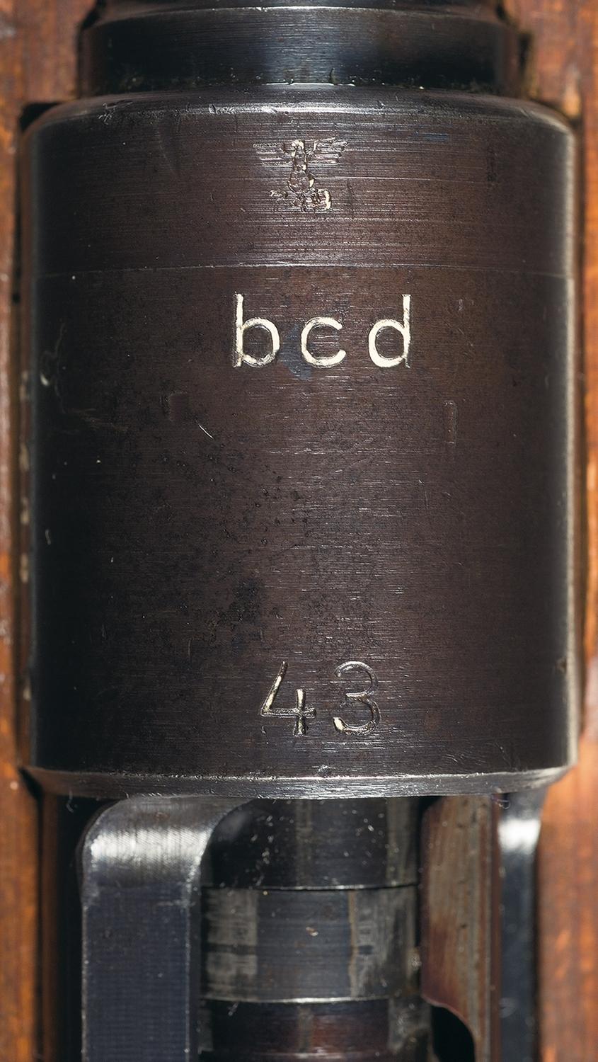 This is an excellent example of a mid-war production K98 rifle as manufactured by the Gustloff factory. The top of the receiver is marked with the "eagle/749" over "bcd" the wartime code for the Gustloff Werke at Weimar and "43" for the year of manufacture and the left side is marked with the Nazi firing proof and the serial number. The left side receiver wall is marked "Mod 98". The left rear portion of the barrel is marked with the firing proof and "? S arrow eagle/13" proof. The rifle has the mid-war pattern all milled components to include the closed and milled upper barrel band. Hooded front sight and tangent rear sight graduated to 200 meters. The stock and handguard are the correct "bcd" produced laminated wartime versions and the stock has the correct single "C" proof and Waffenamt on the lower stock area. Complete with an original wartime cross-hatched leather sling, cleaning rod and bayonet with metal scabbard and leather frog. The bayonet has Bakelite grips, is mis-matched and marked "cof / 43" (Eickhorn). The scabbard is matching and the frog is marked "0/0676 / 0039 / 43" on the back.