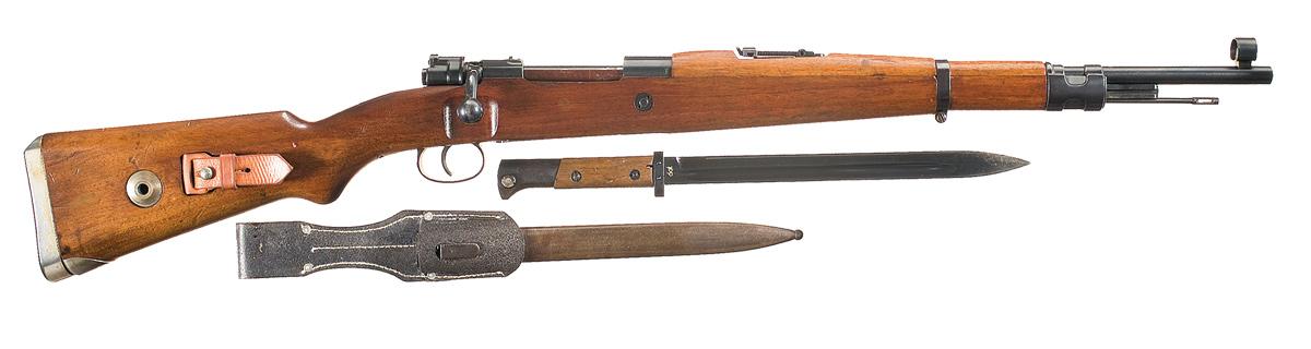 This is an exceptional original example of a Nazi G33/40 carbine with bayonet. Hooded blade and tangent sights, with a "T" stamped on the receiver ring. Milled components, with matching number on the bolt handle. Smooth stock with matching number and distinctive cupped and extended buttplate. With a brown leather sling and a Brunn bayonet with 11 3/4" blade, smooth wood grips, metal sheath and leather frog.