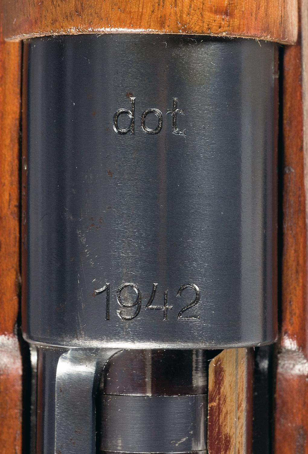 Condition: Excellent, with 98% plus of the original blue, showing a plum patina on the bolt, mild handling marks and sub-surface pitting. Stock is also excellent, with exception of a few filled-in areas and scattered pressure dents and scratches. Leather is excellent, and the bayonet is very fine with bright wear on the blade. Mechanically excellent. If you want to own one example of a G33/ 40, here it is!