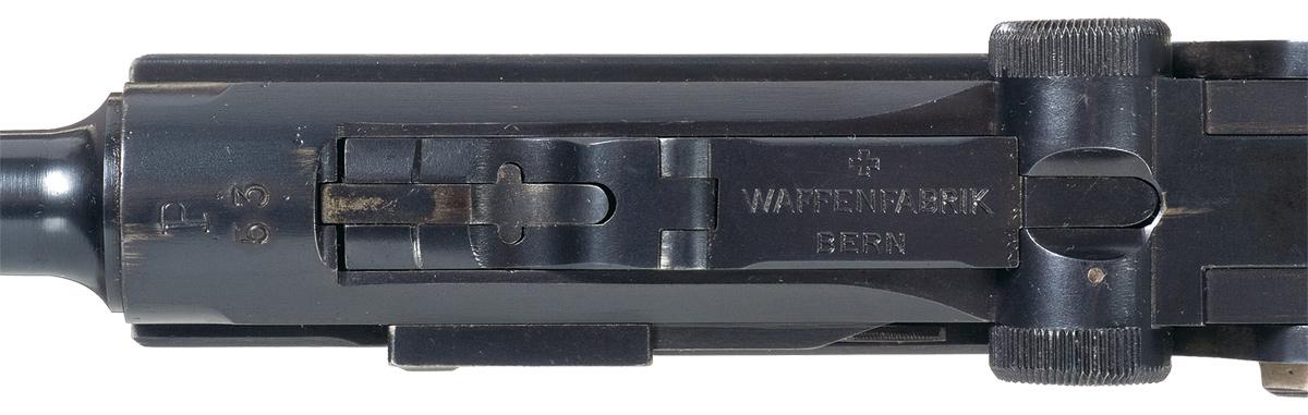 Due to World War One, (when German makers were no longer able to supply the Swiss), The Swiss began producing Luger pistols, due to military needs. Fixed sights, with "P/ 53" on the chamber, "WAFFENFABRIK/ BERN" on the toggle, "+/M" on the extension and Swiss crosses on the barrel, extension, frame, breechblock and toggle. Matching full and partial numbers on the barrel, extension, frame, side plate, trigger, breechblock and toggle links, other parts blank. Fitted with proper smooth bordered checkered grips, straw finished small parts, niter blue grip screws and a nickel magazine with wood base.