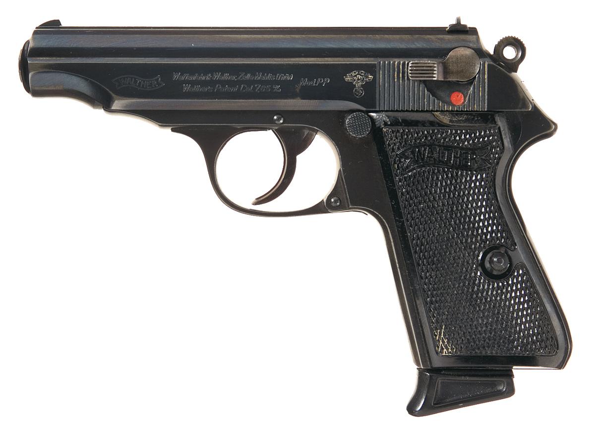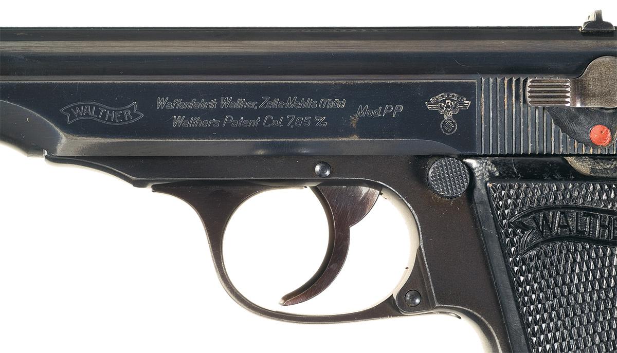 This is a super rare example of a very late production, NSKK marked Walther PP in 7.65mm. These pistols were issued to officers in the National Socialist Transport Corps, (National Sozialistisches Kraftfahr Korps). The left side of the slide is marked with the Walther banner, followed by the two line address and caliber markings, "Mod.PP", and the NSKK markings that consist of the "NSKK" Banner on top of a German spread-wing eagle holding a swastika. The right side of the barrel and the frame under the ejection port are marked with Eagle "N" proofs, and the serial number runs vertically down the right side of the frame in front of the grips. The inside of the slide has the matching last three digits of the serial number. The pistol is fitted with the correct wartime two-piece black plastic checkered grips that have the Walther banner at the top of each grip. It is complete with one Walther marked magazine with the black plastic finger extension on the bottom.