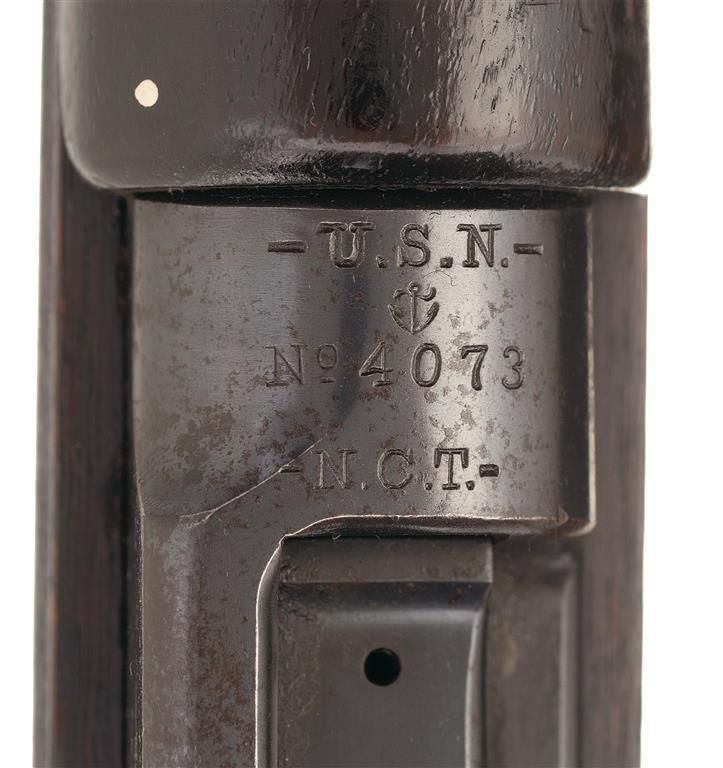 Manufactured in 1895 by Winchester for the U.S. Navy this rifle is chambered in the 6mm Lee or .236 caliber. This example is in a musket configuration with a full semi-pistol grip stock featuring a hand guard and a front barrel band with a bayonet lug. It has a hooded front sight and an adjustable rear sight graduated to 2,000 yards. The top of the chamber is stamped "-U.S.N.-/[anchor]/No 4073/-N.C.T.-". The left receiver wall is stamped with the two line Winchester address/patent dates marking. There is a stacking swivel mounted on the front barrel band, sling swivel on the rear barrel band and a swivel base on the buttstock. The iron buttplate has a compartment with an original string and brush pull through bore cleaner.