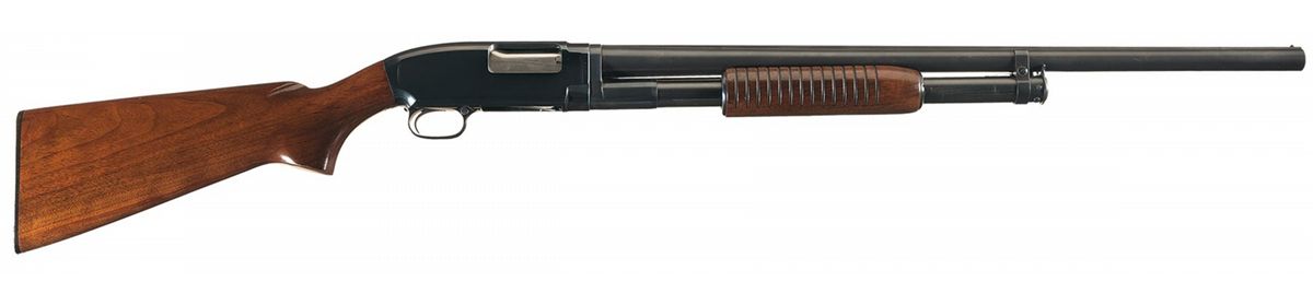 Manufactured in 1955. Single brass bead sight on a matte solid rib, choked cylinder and a 2 3/4 inch chamber. Standard markings on the left side of the barrel. Mounted on a 14 groove ribbed flat bottom forearm and smooth pistol grip stock with a checkered plastic buttplate. Length of pull is 14 inches.