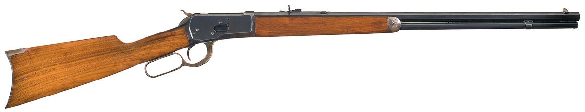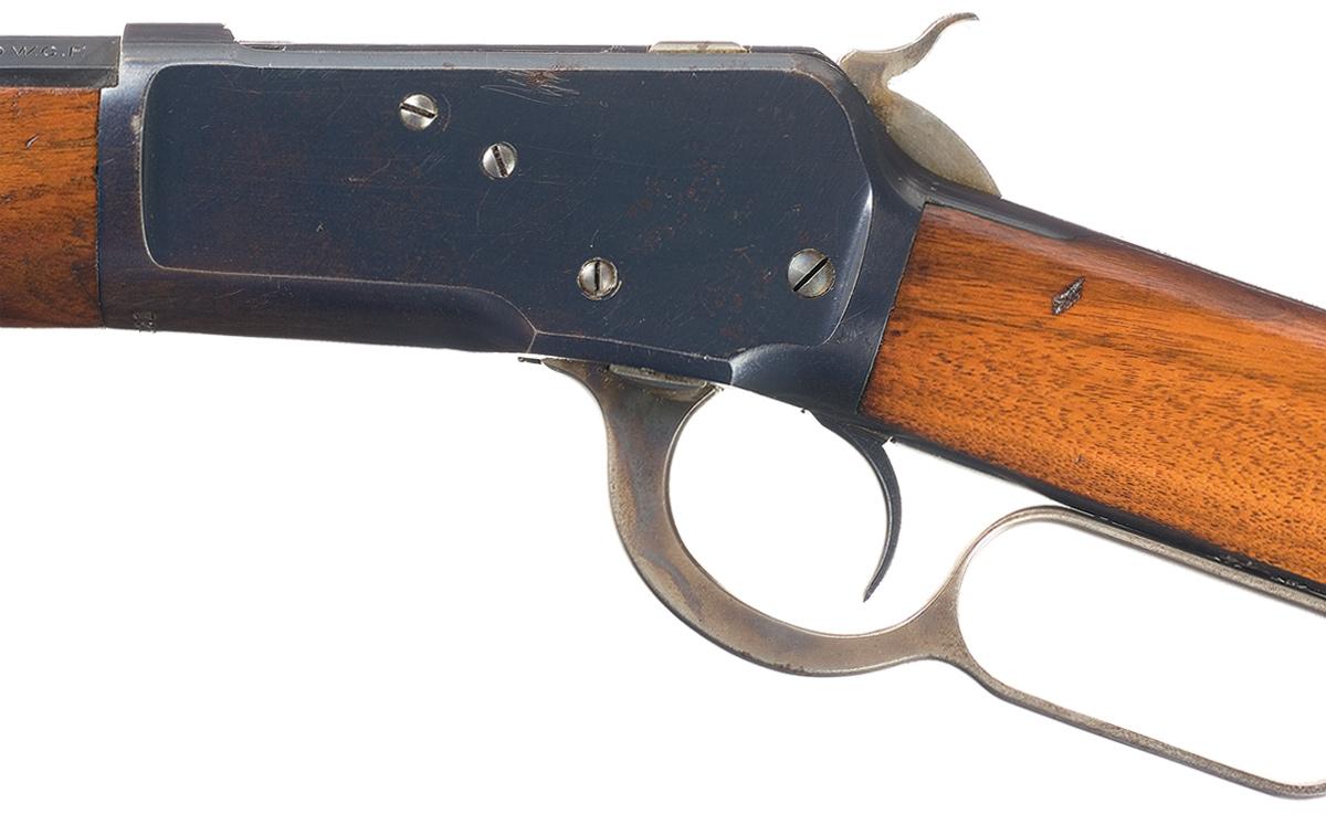 Condition: Excellent. The rifle retains 90% of the original blue finish overall. Finish wear is concentrated on the upper receiver tang, receiver edges and forearm cap. The case colors on the bottom of the loading lever and the buttplate are 50% intact with the balance a silver patina. The stock and forearm are both in excellent overall condition with most of the original varnish finish and some minor handling marks. This is an excellent, original example of a Winchester Model 1892 Sporting Rifle.