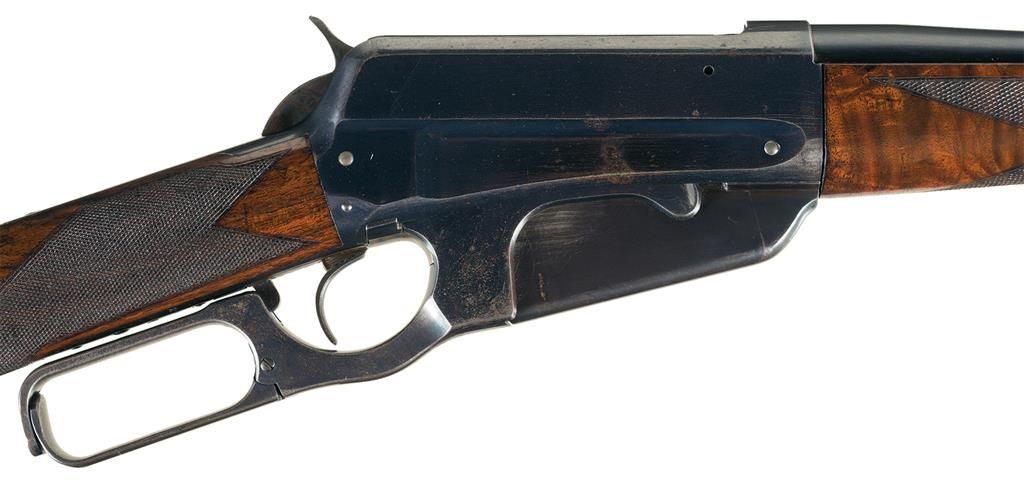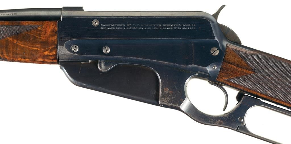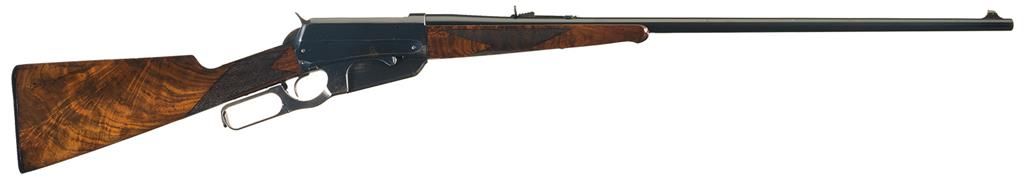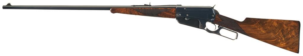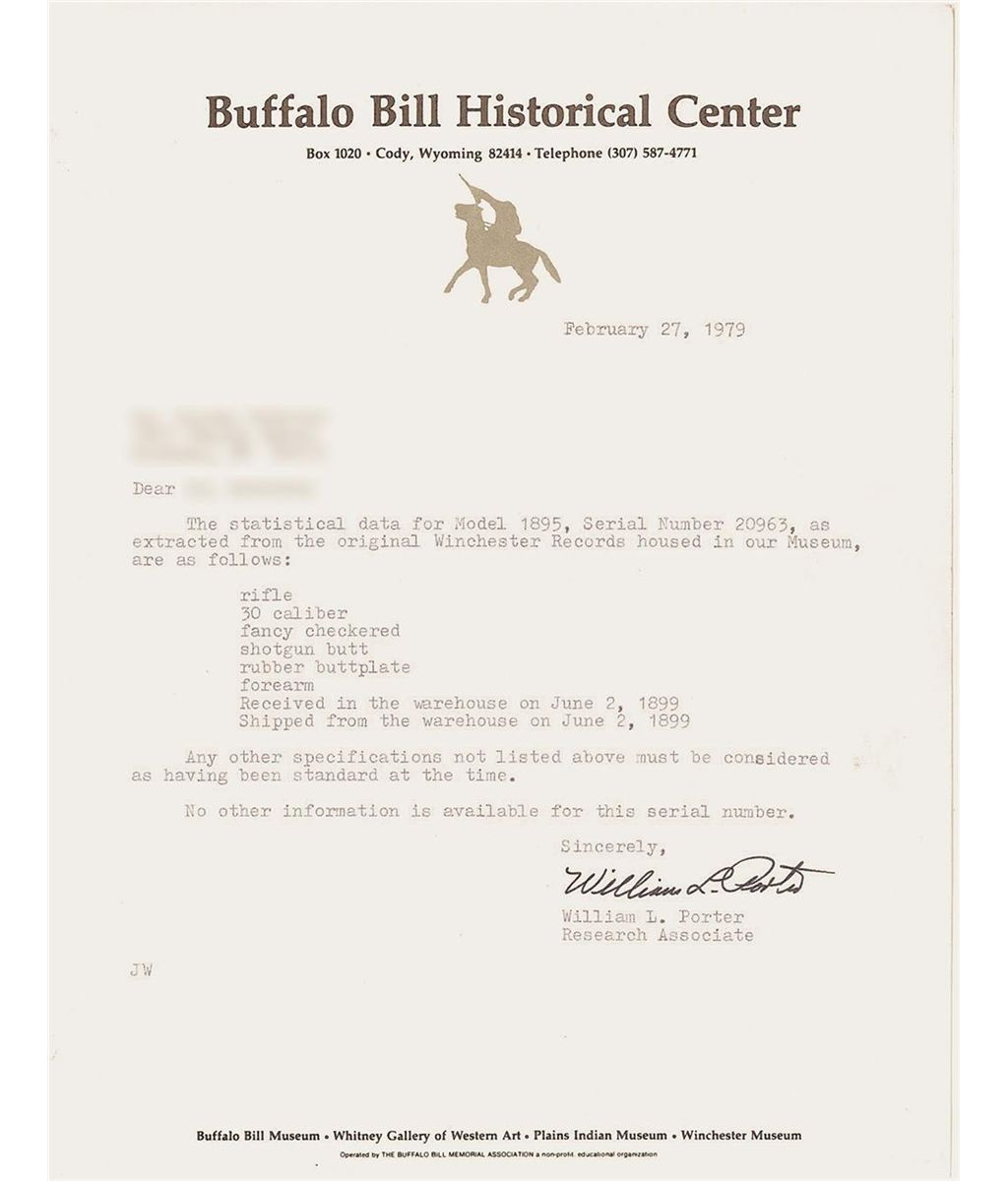 This is an exceptional example of an early production, Deluxe Winchester Deluxe Model 1895 Fancy Lever Action Rifle with highly figured, checkered, burl walnut stock and forearm. The Cody Firearm Museum letter that accompanies the rifle states that it was shipped from the Winchester warehouse on June 2, 1899. The letter also states that the rifle had a "fancy checkered stock, shotgun butt with rubber buttplate, in .30 Caliber". This beautiful rifle is also fitted with a deluxe burl walnut forend, that also has matching finely checkered panels on three sides. Both the stock and forearm have the Winchester high polished hand rubbed wood varnish. The rifle is fitted with a 28 inch barrel that has the integral front sight, lugs/base mounted on the barrel with a single silver blade front sight and a Winchester sporting adjustable rear sight. The left side of the barrel is roll-stamped "- NICKEL STEEL BARREL-/ESPECIALLY FOR SMOKELESS POWDER", with the caliber designation: "30 U.S." stamped on top in front of the receiver ring. The Winchester factory legend/patent markings are stamped on the left side of the receiver. The upper receiver tang is stamped "WINCHESTER/-MODEL 1895-" and the serial number "20963" stamped on the lower receiver tang.