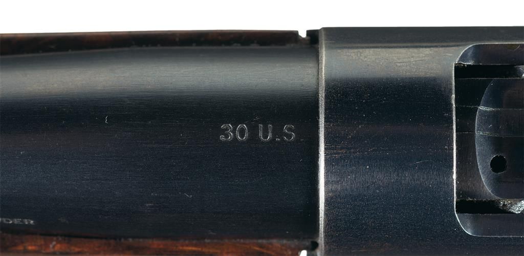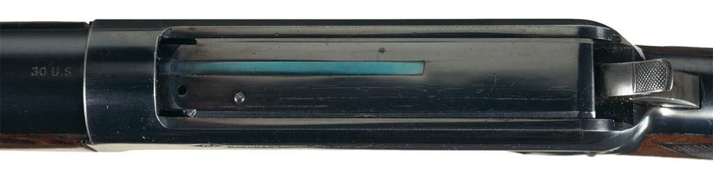 Excellent with 95% plus of the original blue finish overall showing only minor wear on the front end of the cocking lever, and inside the loop. The excellent stock and forend retain most of their original Winchester factory varnish with only some minor handling marks and on the sides and under side. The checkering is also excellent with distinct checkering on overall with only some minor handling marks. The wood to metal fit is excellent. An excellent high end factory documented Deluxe Winchester model 1895 lever action rifle in the desirable .30 US.