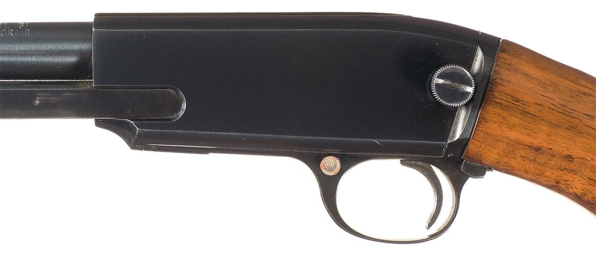 Condition: Excellent. The rifle retains 97% plus original finish with wear limited to the slide bar from cycling the action and some high edge wear on the receiver. The wood is excellent with exception of a minor scratch on the upper left side of the stock and on the lower right rear of the forearm, otherwise only light handling marks. Sharp markings. The action is excellent.