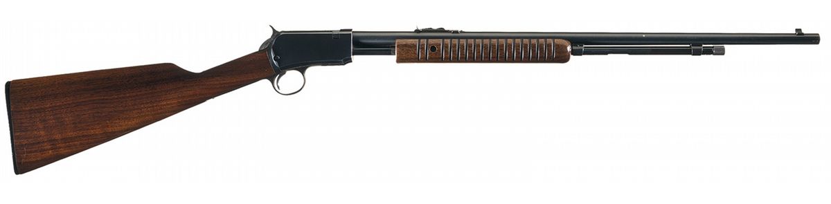 Excellent. The rifle retains 97% original blue finish with some edge wear and normal usage wear on the slide, slide arm and barrel from cycling the action. The wood is also excellent with only a few light handling/storage marks and a couple minor scratches. The markings are sharp. The action is fine.