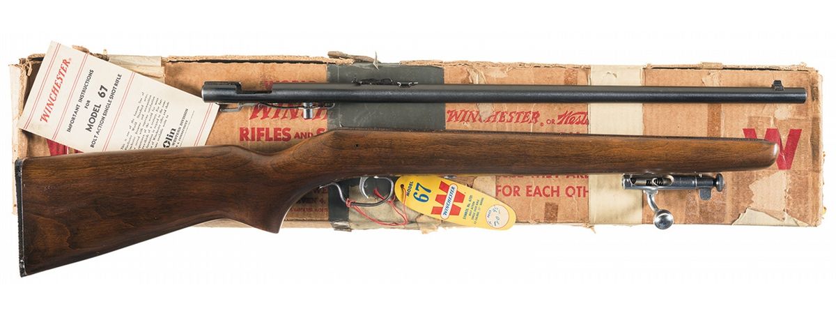 Manufactured from 1934 to 1963. Adjustable rear sight and dovetail front sight on barrel with standard markings. Mounted on a smooth walnut one piece pistol grip stock with a black plastic checkered Winchester buttplate. Plated bolt and bolt handle. In Winchester box labeled to the model (the 67 was only serial numbered for foreign sales) with the instructions and hanging tag.