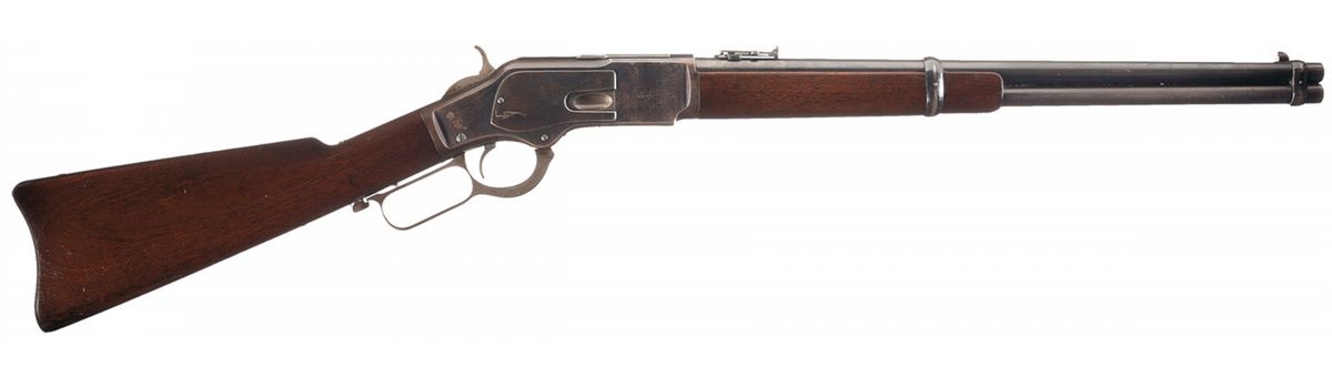 This is a Winchester Third Model carbine that was manufactured in 1881. The carbine has a blue finish on the barrel, magazine, barrel bands and receiver with casehardened lever, hammer and carbine style buttplate. The stock and forearm are straight grain black walnut. The carbine has a round barrel with steel block style front sight, dovetail mounted adjustable folding leaf rear sight and second style upper barrel band. The magazine has the second style cap secured by a screw. The Third Model receiver has an integral dust cover rail and a dust cover with serrated edges. A staple-mounted saddle ring is located on the left side of the receiver. The upper tang is factory drilled and tapped for a tang sight. The butt plate has a sliding brass trap. The top of the barrel is roll-stamped with the two-line legend "WINCHESTER'S-REPEATING-ARMS. NEW HAVEN. CT./KING'S-IMPROVEMENT-PATENTED-MARCH 29.1866. OCTOBER 16. 1860." between the lower barrel band and the rear sight. The upper tang is stamped "{ MODEL 1873}" in fancy letters with foliate devices at either end. The serial number, "91624A" is stamped in script letters on the lower tang behind the lever latch.