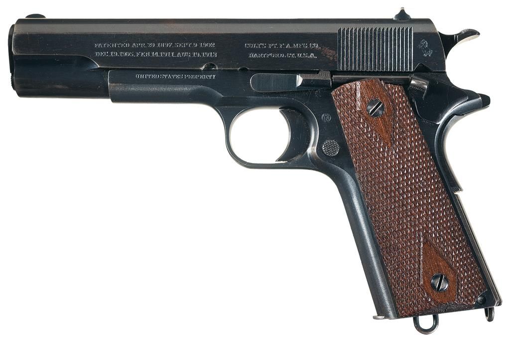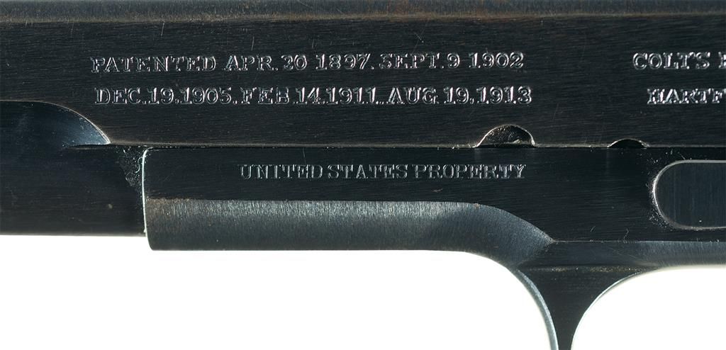 This desirable U.S. Army Colt Model 1911 was manufactured in early 1917 shortly before the United States entered WWI. The left side of the slide is marked with the two-line, two-block Colt factory patent dates of 1897-1913 and the factory address, followed by the Rampant Colt, behind the serrations. The right side is roll-marked "MODEL OF 1911.U.S.ARMY". The left side of the frame is roll-stamped "UNITED STATES PROPERTY" and the right side is roll-stamped with only the serial number "No. 156692". The left side of the frame is stamped with the initials "GHS", U.S. Ordnance inspector Major Gilbert H. Stewart. The barrel is correctly stamped with the separate "H" and "P" proofs on the chamber area. The rear of the slide has the small letter "H" provisional inspector stamp above the firing pin stop. It is fitted with the early checkered slide stop release, checkered thick thumb safety, wide spur checkered hammer, flat mainspring housing and short horned grip safety. It is fitted with checkered walnut grips with a diamond pattern around the screws and is complete with WWI Colt half-tone lanyard loop magazine.