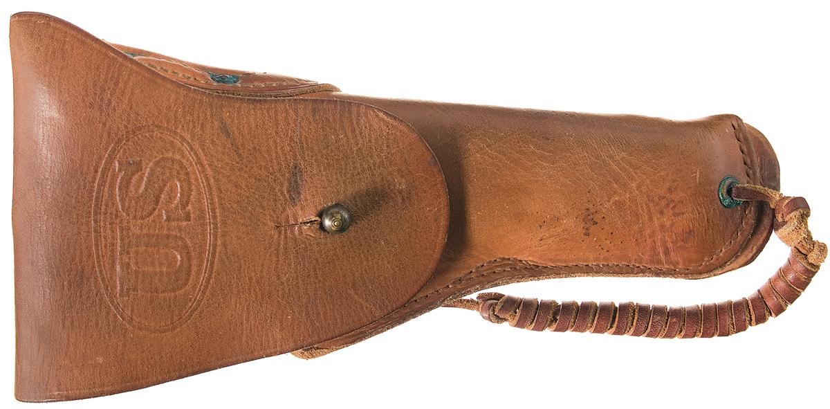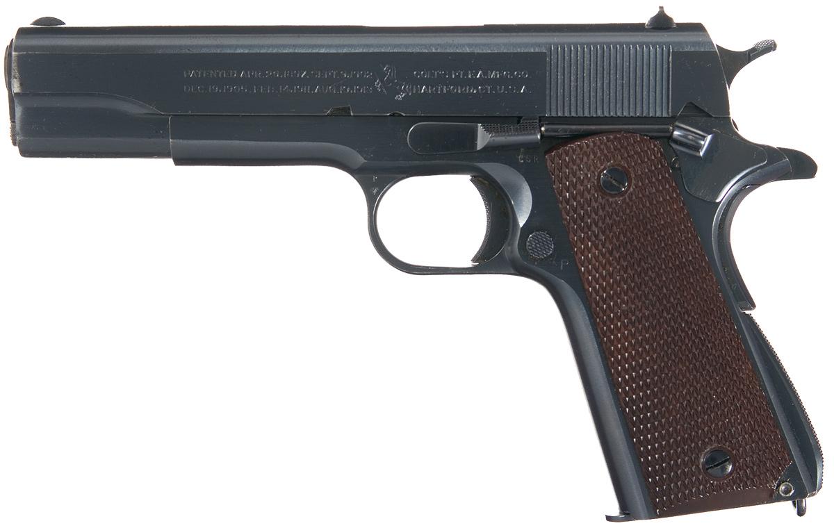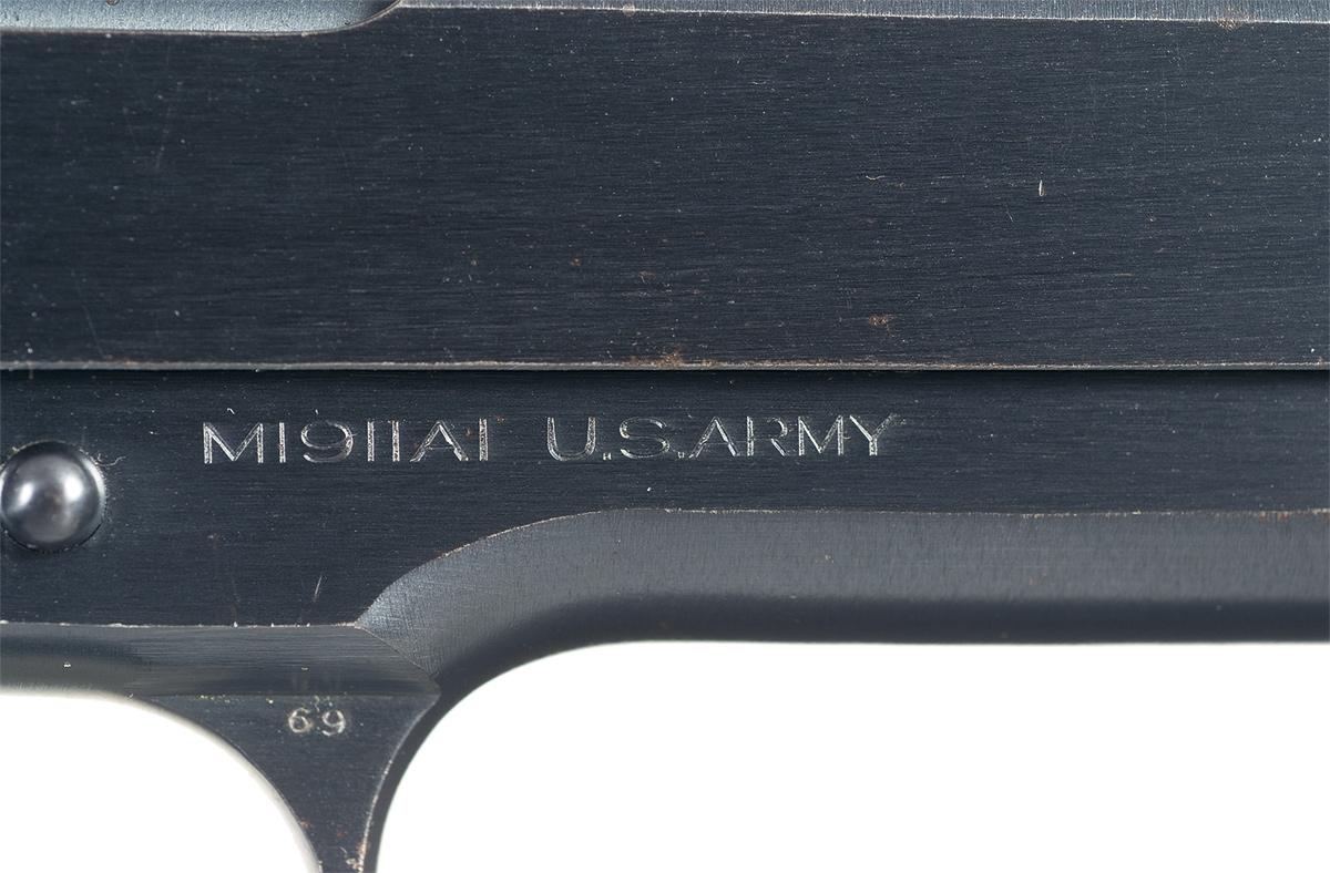 This excellent original Colt M1911A1 Pistol was manufactured in 1940. The pistol has the pre-WWII brush blue finish with blued barrel and checkered, brown plastic, grips. The pistol has the WWII pattern short hammer and milled trigger with checkered main-spring housing, safety lock and slide stop. The right side of the slide is roll-stamped: "UNITED STATES PROPERTY/No717706" in two lines behind the slide stop hole followed by "M1911A1 U.S.ARMY" ahead of it. The left side of the frame is stamped with the Colt "VP/Triangle" commercial proofmark and a small "P" assembly mark on the trigger guard bow and the "CSR" Ordnance final inspection stamp and "P" proofmark in front of the grip. The left side of the slide is roll-stamped with the 1897-1913 patent dates in an elongated, two-line block followed by the Rampant Colt trademark and two-line Hartford address. A "P" proofmark is stamped on the top of the slide ahead of the rear sight. The pistol serial number is stamped on the rear face of the slide behind the firing pin stop. The pistol is complete with three full blue, pre-war commercial magazines, a WWI contract magazine pouch marked: "P&B CO./JAN. 1918" on the inside of the flap, a WWII, SEARS, russet leather, M1916 holster with tie-down strap and four, 20-round cartons of WWI government contract .45ACP cartridges.