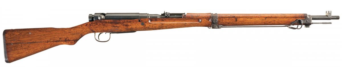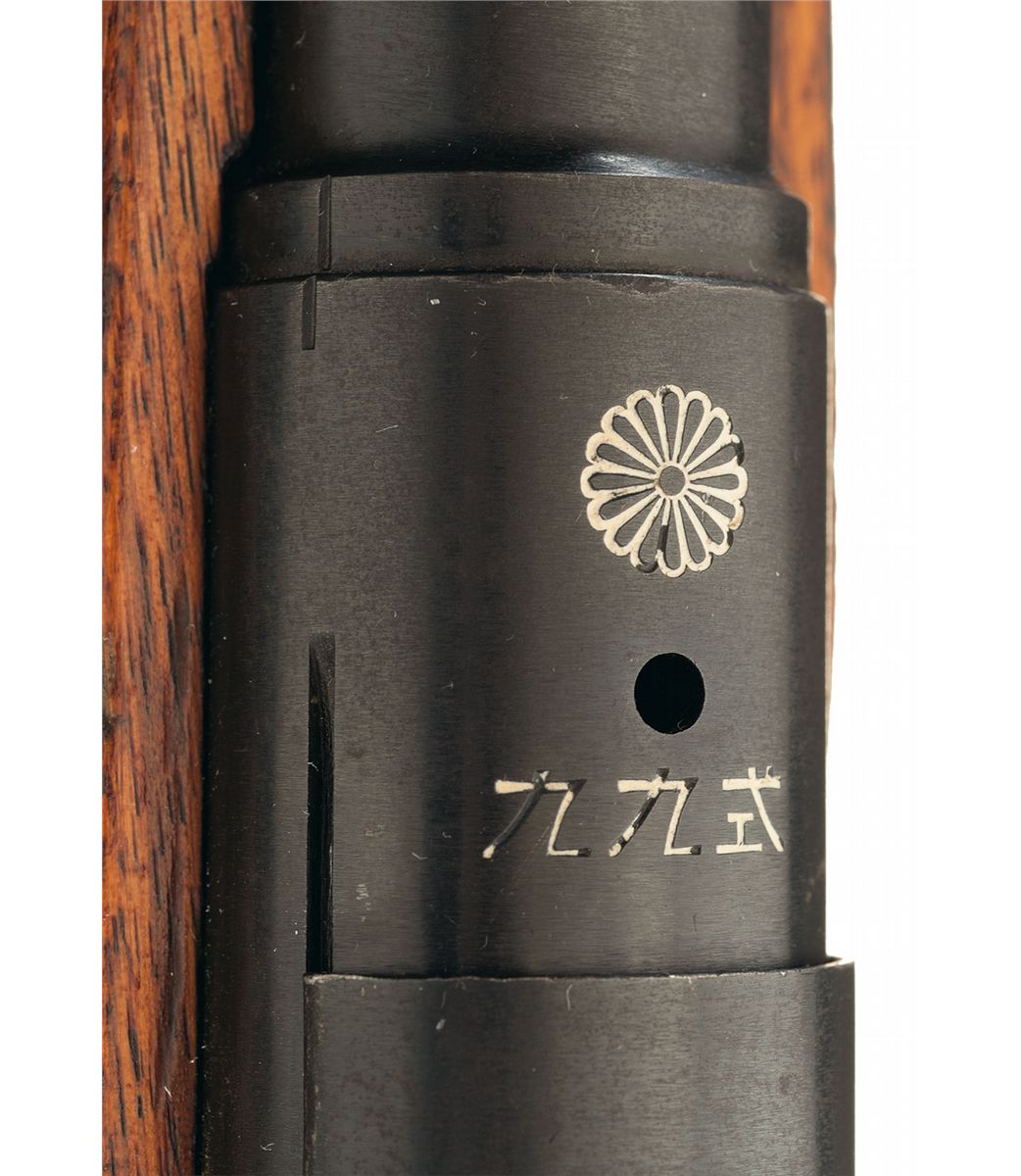 This is an excellent example of a Toyo Koyo Series 31 rifle manufactured at Hiroshima. The top of the receiver is marked with a sharp mum over the Type 99 marking with the Series symbol, serial number and arsenal marking on the left side. The bolt and dust cover are marked with the matching partial serial number "054" and the bayonet lug is un-numbered. Inverted "v" front sight without guards and folding ladder rear sight graduated to 1,500 yards with anti-aircraft wing, monopod, hinged floorplate and cleaning rod. Mounted with a smooth full length pistol grip stock with matching hand guard, steel cupped buttplate and sling swivels.