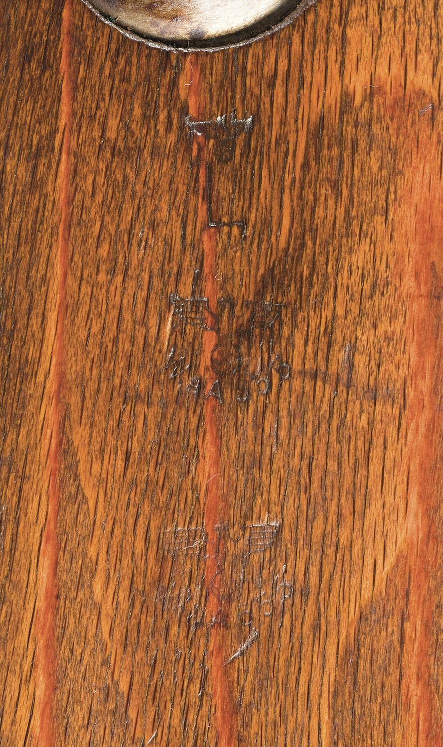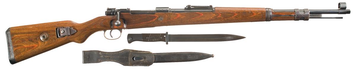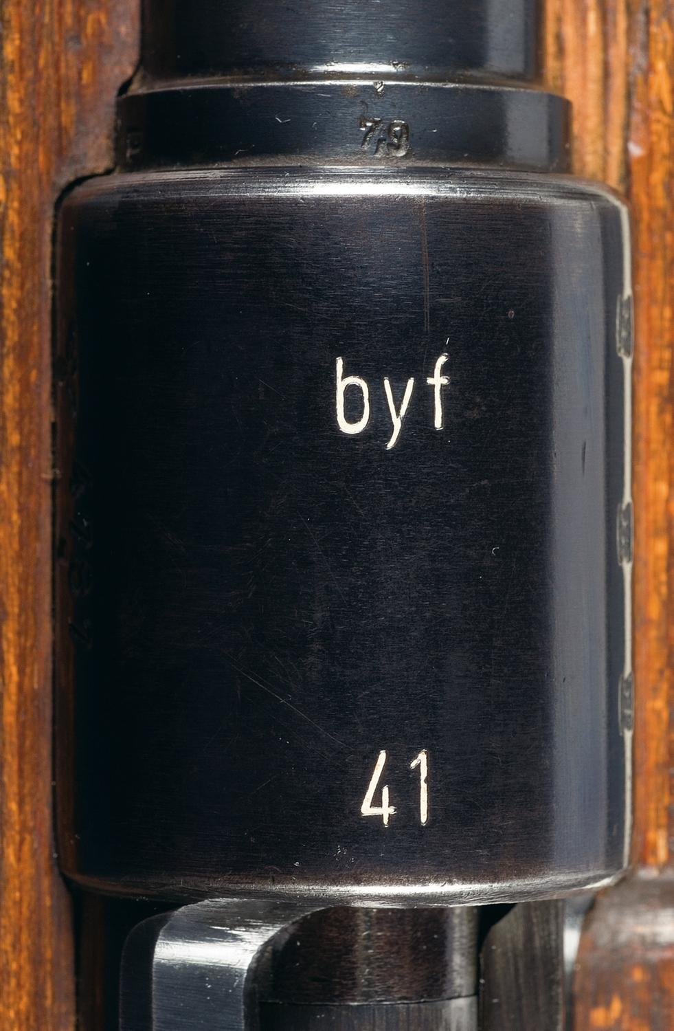 Blade front and notch rear sights, with "40D74" on the barrel near the breech and "eagle/ 655" proofs on the right side of the receiver ring, which also has the "byf/ 41" makers/ date marking. Matching numbers, with the buttplate marked "brg/ 41/ WaA497" (H.W. Schmidt, Saxony), and other parts stamped "eagle/ 655". Milled components. Laminated stock with "eagle/ L" Luftwaffe marking and cupped buttplate. With a cross-hatched brown leather sling and a Horster (Solingen) bayonet, dated 41, 10" blade, ribbed grips, matching sheath and leather frog.