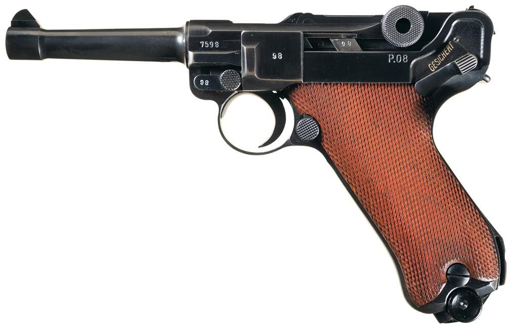 This is a late WWII "byf" Mauser code luger pistol with the "42" dated chamber area. The barrel extension has the standard Eagle/135 acceptance proofs along with the Eagle firing proof. As noted the chamber is dated "42" and the front toggle is marked "byf". It has a standard safety and extractor markings of "GESICHERT" and "GELADEN" respectively and the left side of the frame is stamped "P.08". It has the full serial number (7598) on the left barrel extension, and front of the frame with the partial serial number "98" on the small components. All salt blue finish with checkered walnut grips and blue magazines with black plastic bases. The magazines have the standard markings of: "fxo/Eagle/37" and "P08" near the base with the bases unnumbered or marked. It is complete with a light brown leather holster that is marked on the back: "CARL ACKVA/BAD KREUZNACH/1940/Eagle/WaA266". It is complete with an unmarked takedown tool.