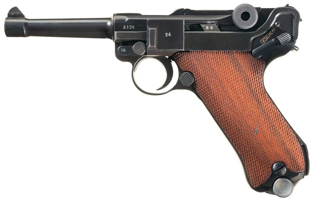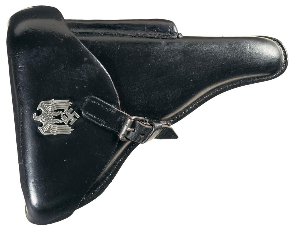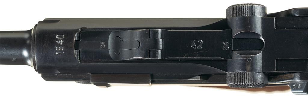 This is an outstanding example of an original pre-war 1940 dated, "42 code" Nazi Mauser Luger rig. These Lugers feature a salt blue metal finish with checkered walnut grips. The chamber area is marked with the full date of "1940" with the new "42" code marking for the Mauser factory on the front toggle. The right side of the barrel extension has the early double "Eagle/655" proofs and the single "Eagle/Swastika" firing proof, with both proofmarks also on the top rear section of the barrel. The left side of breechblock is also marked with the eagle firing proof. The safety and extractor are marked "GESICHERT" and "GELADEN" respectively. This pistol is complete with two late war Army magazines, both have the pinned aluminum bases. One has an unmarked aluminum base while the other one is marked "2134/b/+/Eagle/655". This beautiful Luger is complete with a black 1940 dated leather holster marked "KARL BOCKER/1940/WALDBROL/Eagle/WaA721" on the back. The tool has a partial Eagle proof on the front. This holster has a nice, large Nazi Eagle metal tunic insignia attached to the front of the holster.