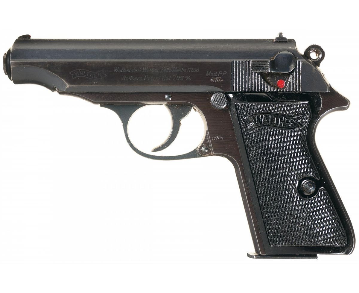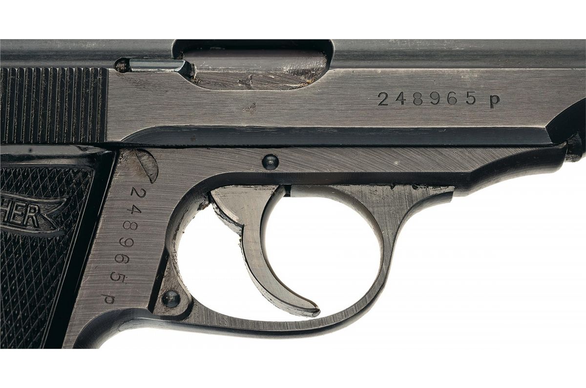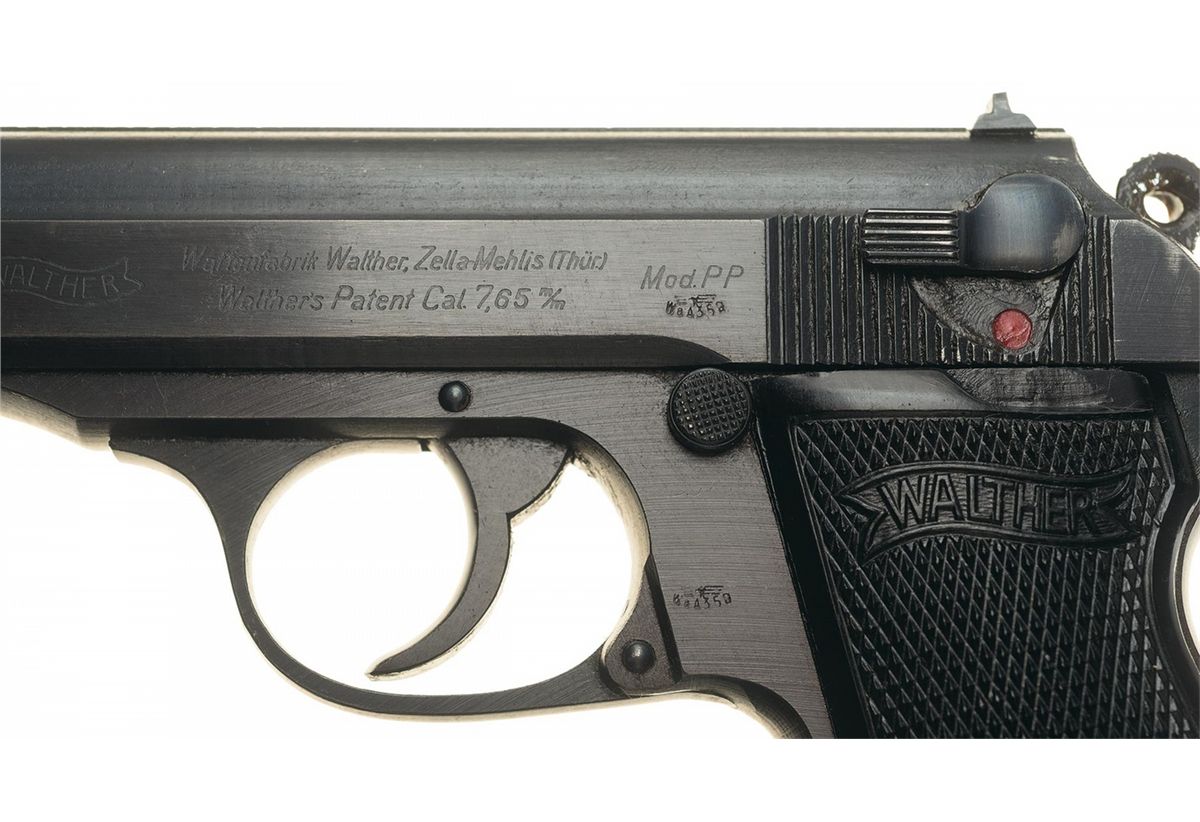 Fixed sights, with "eagle/N" proofs on the chamber, muzzle and slide, "WaA359" Heer stamps on the left side of the slide and frame, and the Walther banner, 2-line address and caliber markings and "Mod. PP" on the left side of the slide. Matching numbers are present on the right side of the slide and frame. Fitted with a 60 degree safety, loaded chamber indicator, and checkered Walther banner grips.