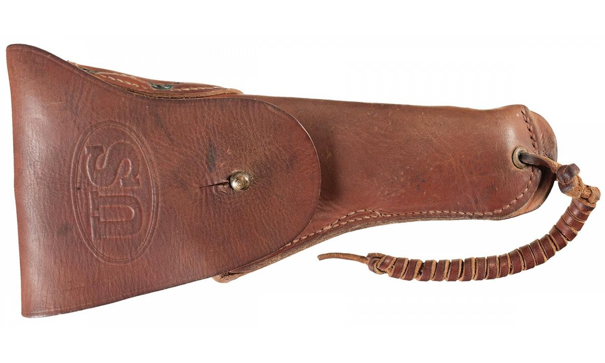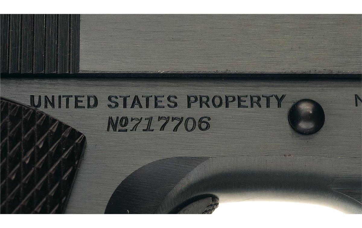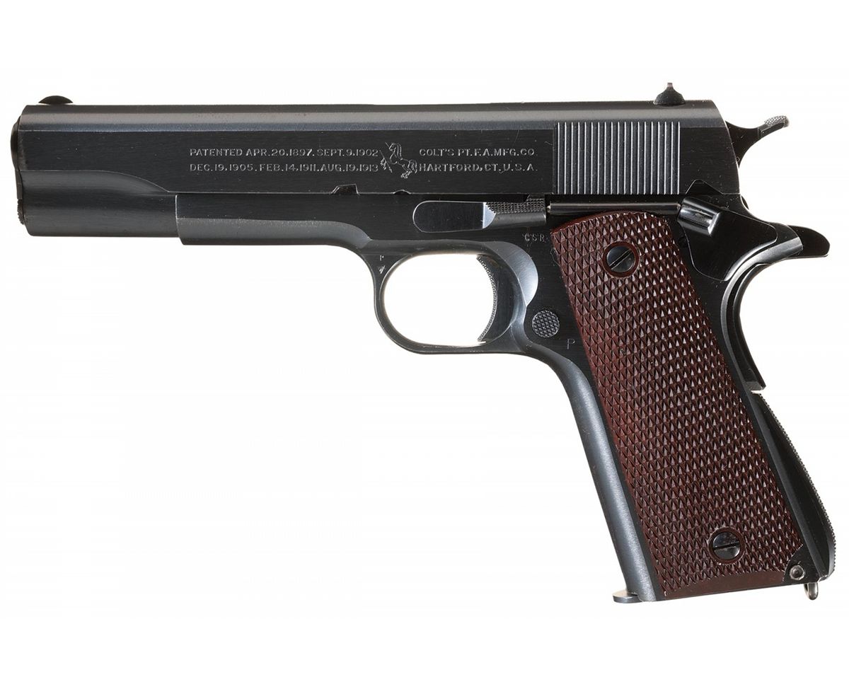 This excellent example of a Colt Model 1911A1 pistol manufactured in 1940. This was in the first of serial number block of pistols (1,300) shipped to the Springfield Armory in 1940. It has the pre-WWII brush blue finish with blue barrel. The left side of the slide is marked with the two line/two block patent dates and address markings with the Rampant Colt in the center and the top of the slide is marked with a "P" ahead of the rear sight. The right side of the frame is marked "UNITED STATES PROPERTY" over the serial number, and M1911A1 U.S. ARMY". The left side of the slide is marked with the "CSR", the inspection mark of Major Charles S. Reed below the slide hold back and "P" below the magazine release. The upper left front of the trigger guard is marked with a "P" over the Colt triangle "VP" proof and "69" is on the opposite side. The matching serial number is stamped on the rear of the slide behind the firing pin stop. Standard fixed sights, blue "COLT/45 AUTO" marked magazine and fitted with brown checkered plastic grips and lanyard ring on the heel. The pistol is complete with a WWI contract magazine pouch marked "P&B CO./JAN. 1918" on the inside of the flap, two extra blue Colt marked magazines and a WWII, Sears 1942 dated russet leather Model 1916 holster with tie-down strap.