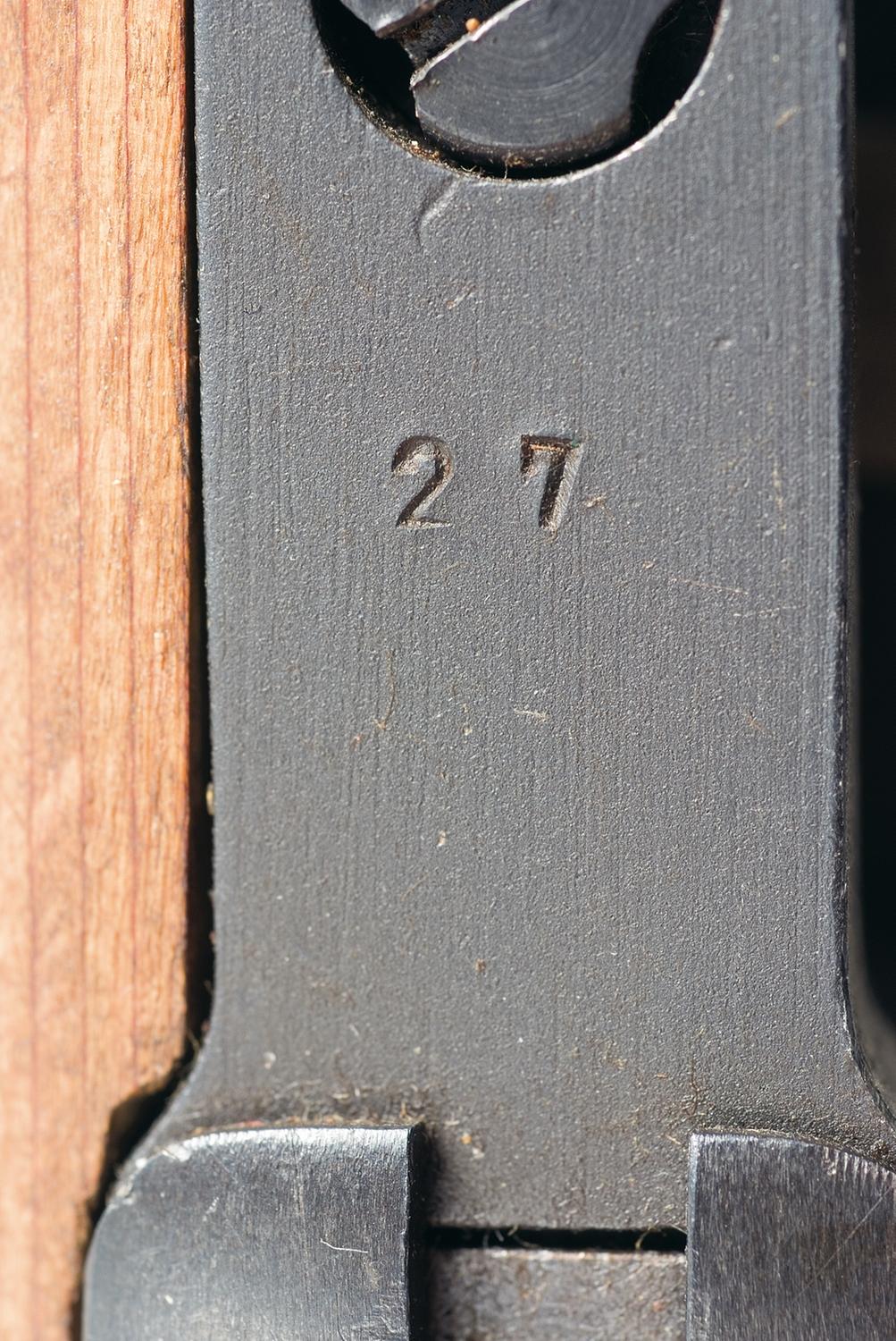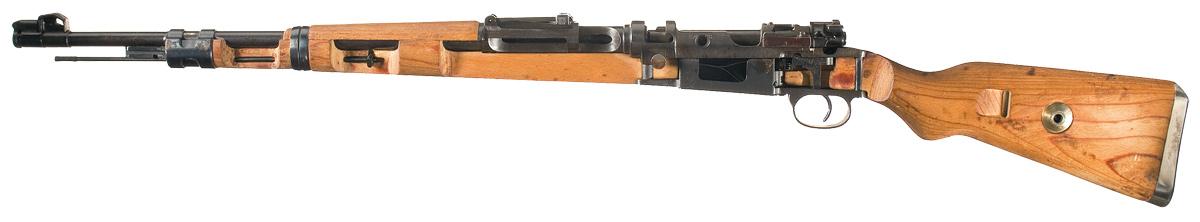This is an excellent example of a factory or arsenal cutaway K98 service rifle. These were a standard K98 that had been cutaway in numerous areas to show the internal functioning and interfacing of the various parts during actual operation. Obviously these were intended as training aids for either basic training or armorers. This specific rifle does not show any of the typical proof and receiver markings other than a "42" on the lower rear edge of the receiver ring, suggesting manufacture in 1942 and "MOD 98" on the receiver side wall. There is a small "Eagle/214" Waffenamt proof on the top rear section of the barrel, which may indicate manufacture at the Berlin-Lubecker Machinefabriken-Werkes at Lubeck (wartime code of duv) and a small serial number "27" on the front edge of the trigger guard, the front side of the bolt handle and the striker. The bolt assembly is completely void of any firing or acceptance proof marks which would be correct for an original factory cutaway rifle. As noted the rifle has been cutaway in all of the major functioning areas of the rifle to include; the firing pin and spring assembly of the bolt, the cocking piece, sear and striker engagements, the complete receiver ring area showing the lug engagements, the chamber area of the barrel, the underside of the rear sight assembly, and the side of the box magazine. The left side of the stock and hand guard assembly have also been correctly cutaway to show the various functional areas of the stock and recoil lug engagements. This rifle is complete with an original cleaning rod and push-on folding muzzle cover.