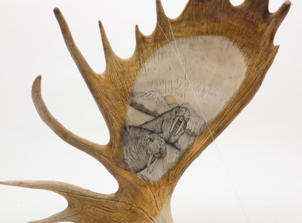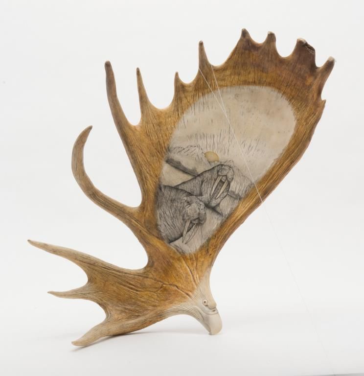 Excellent carved and scrimshawed Moose antler in Eagle and Walrus designs; signed “D. Richards Traze – 1997”; a 9 on a 1 to 10 scale. Est.: $600-$1,200.