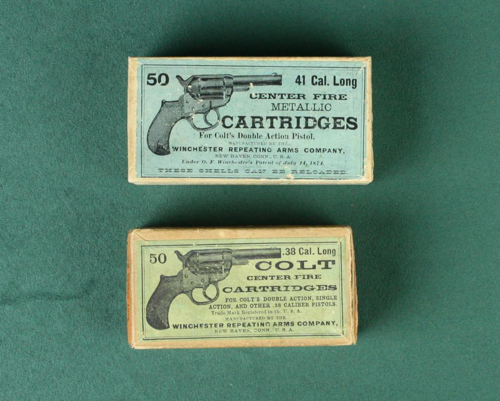 Excellent condition lot of two antique picture boxes of ammunition including a box of 50 .41 Caliber Long CF cartridges showing a Colt Model 1877 ejectorless revolver by Winchester Repeating Arms Co. on the lid with light blue background; the second box contains 50 .38 caliber Long CF cartridges showing a Colt Model 1877 ejectorless revolver, also by Winchester. These full boxes are two of the cleanest and bestconditioned examples we have seen in some time! Est.: $300-$600.