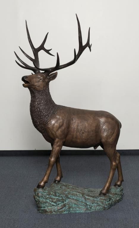 Excellent massive bronze sculpture of a baying Elk signed on base; approx. 6’ 3” in height and 4’ 2” in length weighing several hundred pounds; estimated retail replacement cost at upwards of $10,000. (NOTE: GIVEN SIZE AND WEIGHT, WILL BECOSTLY TO CRATE AND SHIP). An outstandingly beautiful piece of workmanship! Est.: $2,500-$5,000.