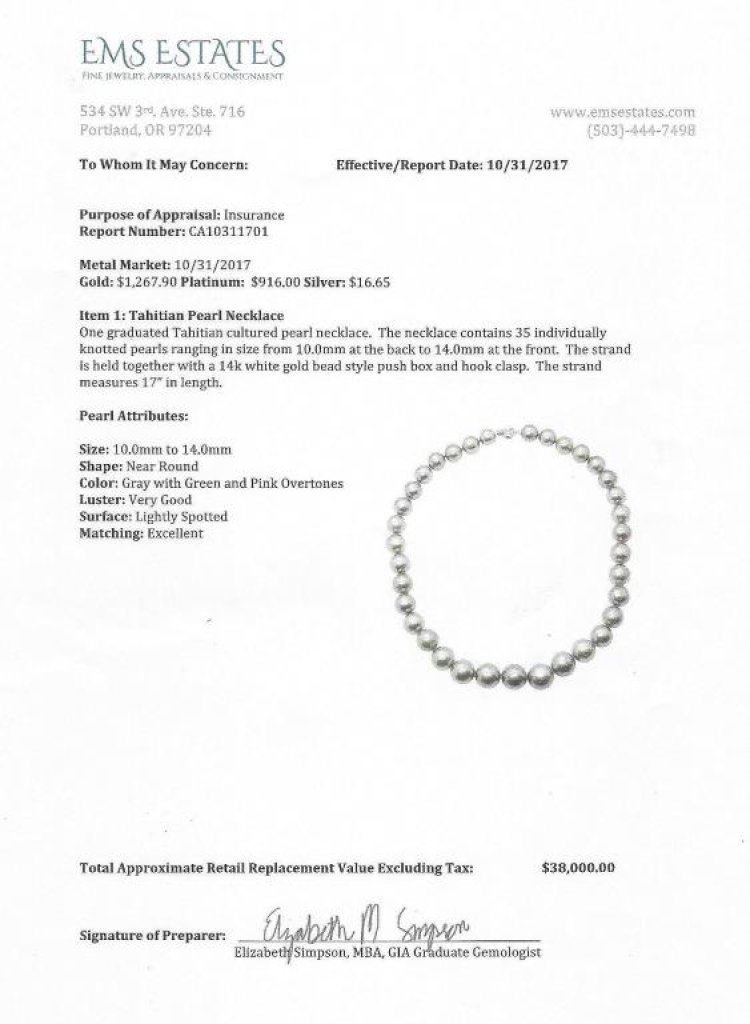 lusters averaging 10.00MM- 14.00 MM in diameters with 14 karat white gold clasp. Full retail Appraisal at $38,000.00 Est:$7000-9000