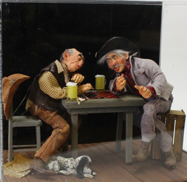 by B Brigham depicting 2 cowboys drinkin beer and playin checkers, display case 8" X 10" X 12". Est. 250-400