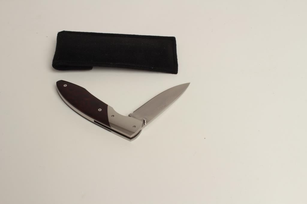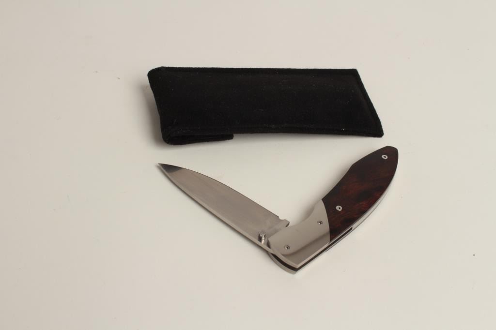 on the blade “J.R. Blanchard” with exotic wood scales and removable pins. Measures 6 5/8” overall and 3 5/8” hnd ground blade. Excellent condition. A real gem of a knife! From the estate of Frank Sinatra Jr. Est.: $300-$600