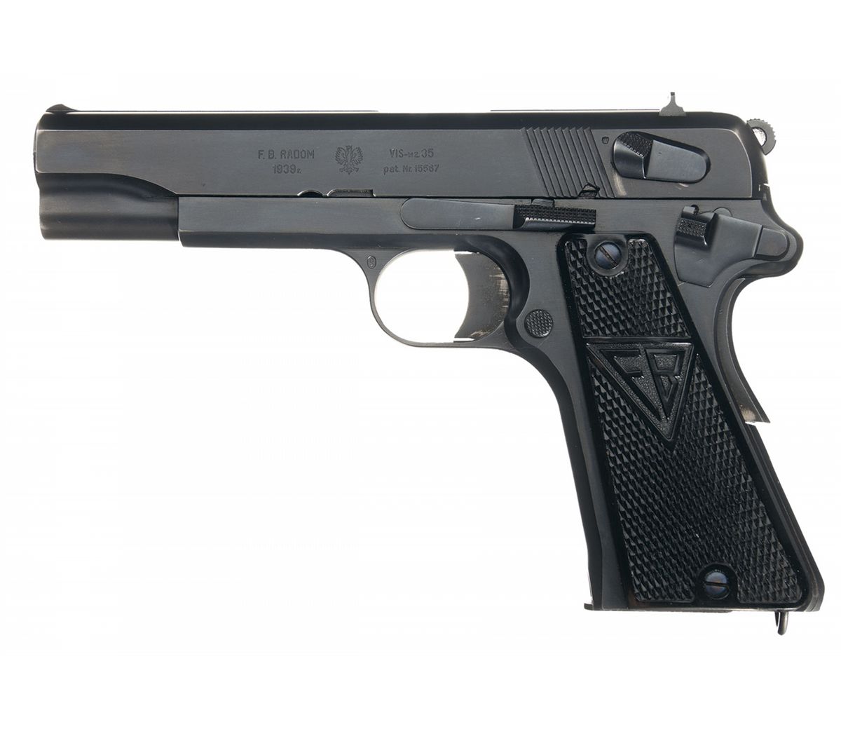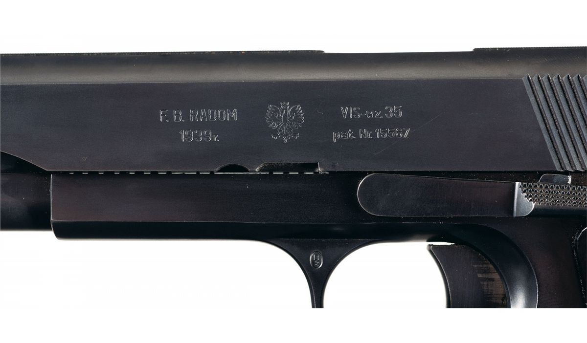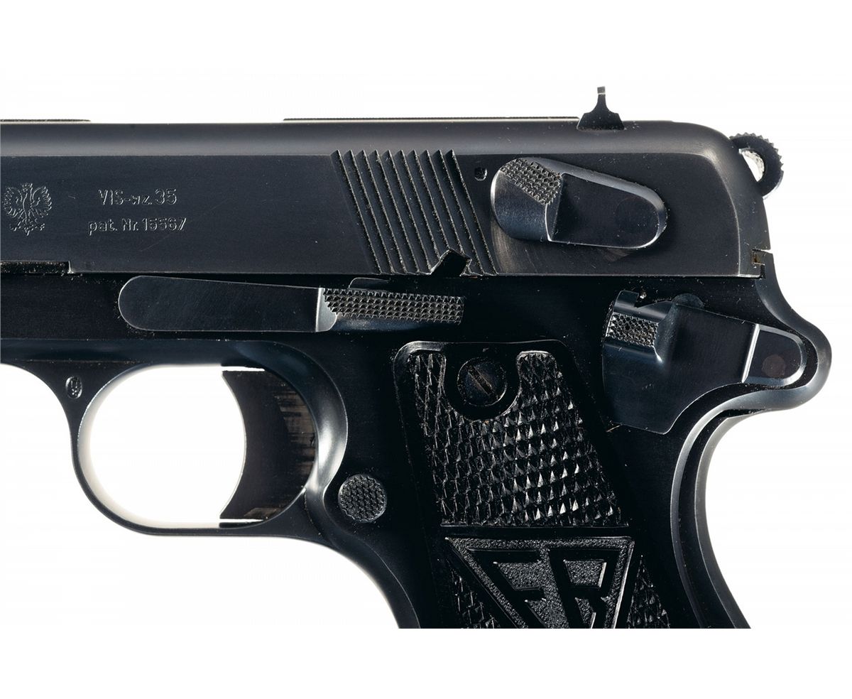This is an excellent original example of a scarce pre-war Polish Eagle Radom VIS-35 pistol as manufactured in 1939. After the fall of Poland in early WWII the Polish Radom pistols became a secondary issue weapon used widely throughout WWII by the German Army. These early pistols can be distinguished by the Polish Eagle and the date of manufacture on the side of the slide. The grips have "VIS" molded into the right grip and "FB" into the left. These early pre-war pistols are all equipped with the three, levers: decocking, slide stop and takedown lever, on the left side of the slide and frame. The rear back strap was also milled with a slot for a detachable wooden shoulder stock similar to those used on Lugers and 1896 Mauser pistols. The left side of the slide is marked in two lines/two blocks with "F.B. RADOM/1939r" followed by "VIS-wz.35/pat. Nr.15567", with the "Polish Eagle" crest in-between. The full serial number (32192) is located on the right side of the frame behind the take down lever pin hole, inside the frame slot inside the slide and (2192) on the back side of the bright polished barrel lug. Both sides of the trigger guard bow have the small Radom factory proof and inspection marks. The magazine has a dull blue finish and is unmarked.