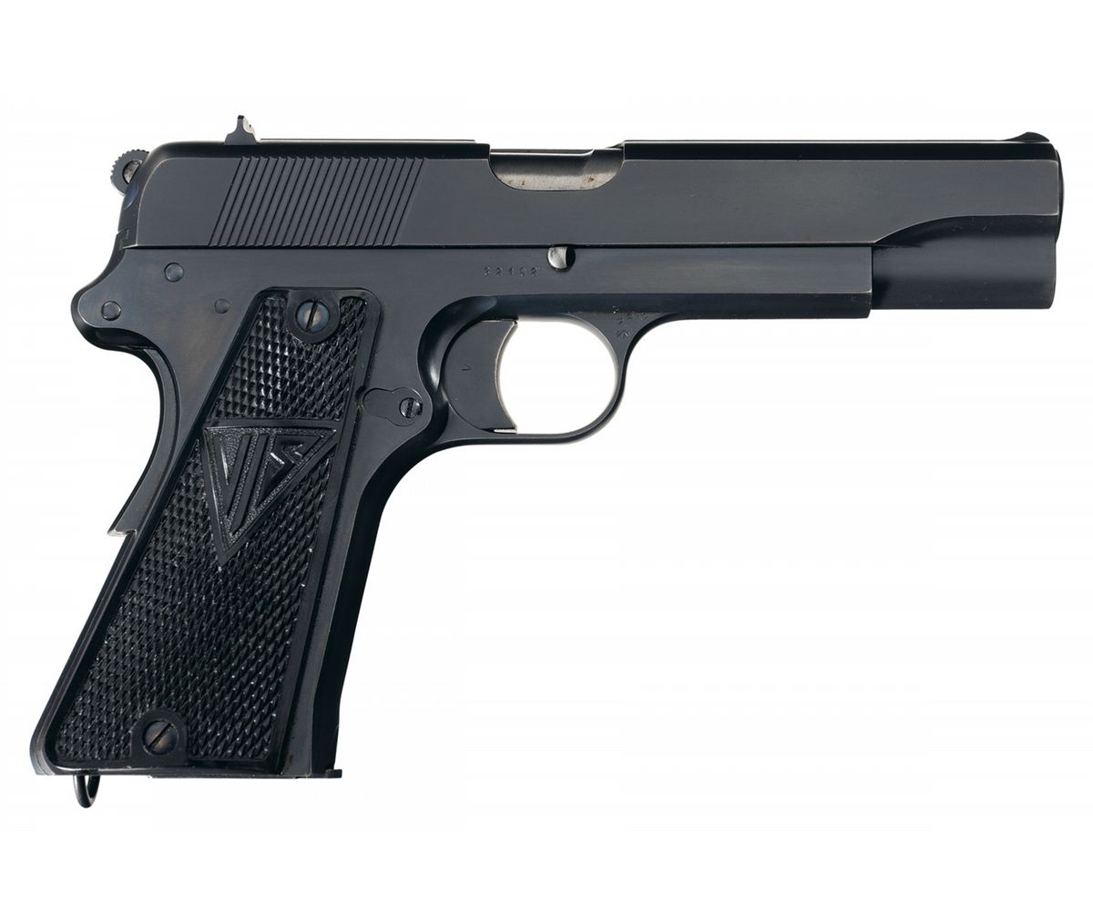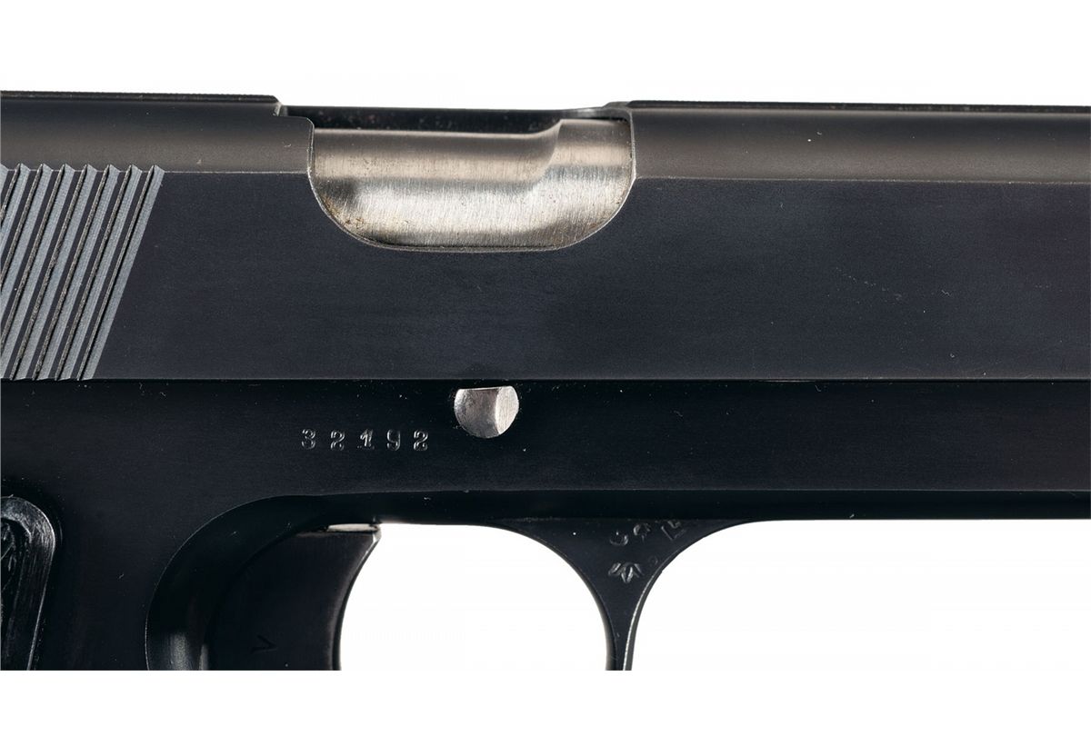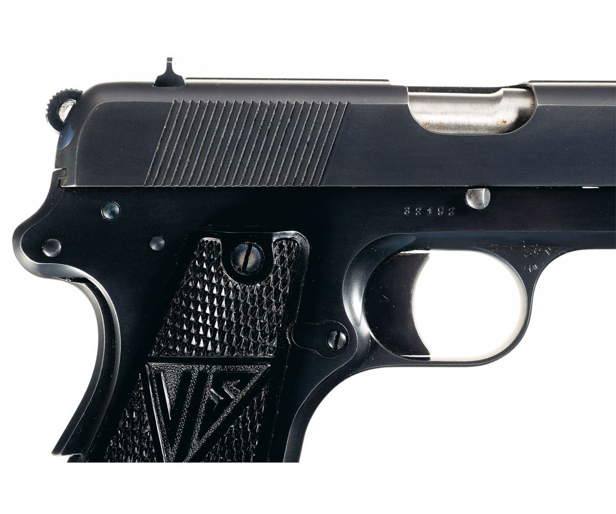 This is an excellent original example of a scarce pre-war Polish Eagle Radom VIS-35 pistol as manufactured in 1939. After the fall of Poland in early WWII the Polish Radom pistols became a secondary issue weapon used widely throughout WWII by the German Army. These early pistols can be distinguished by the Polish Eagle and the date of manufacture on the side of the slide. The grips have "VIS" molded into the right grip and "FB" into the left. These early pre-war pistols are all equipped with the three, levers: decocking, slide stop and takedown lever, on the left side of the slide and frame. The rear back strap was also milled with a slot for a detachable wooden shoulder stock similar to those used on Lugers and 1896 Mauser pistols. The left side of the slide is marked in two lines/two blocks with "F.B. RADOM/1939r" followed by "VIS-wz.35/pat. Nr.15567", with the "Polish Eagle" crest in-between. The full serial number (32192) is located on the right side of the frame behind the take down lever pin hole, inside the frame slot inside the slide and (2192) on the back side of the bright polished barrel lug. Both sides of the trigger guard bow have the small Radom factory proof and inspection marks. The magazine has a dull blue finish and is unmarked.