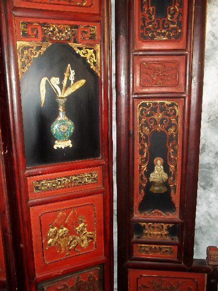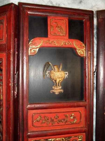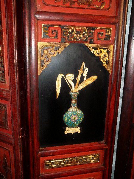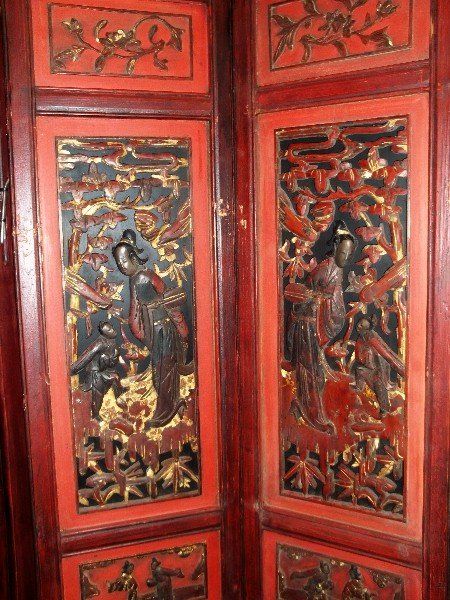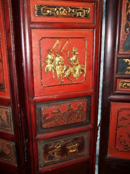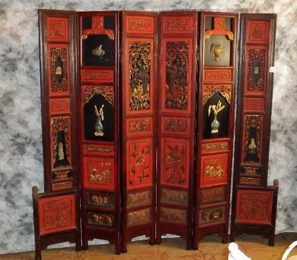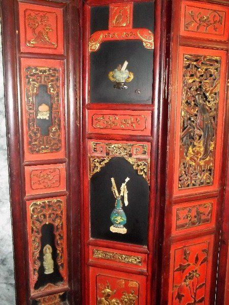 Exceptional 19th C chinese polychromed and carved wood floor screen with jade, cloissone and ivory figures. H:72" W:82" .