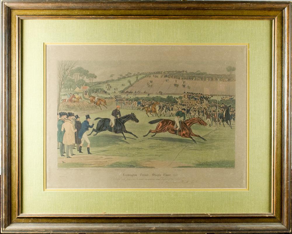 Titled, "Leamington Grand Steeple Chase, 1837," depicting polo players with crowds cheering them on, hand colored. After the original painting by F.C. Turner, after original engraving by Charles Hunt. Below title reads "Dedicated with permission to John Creighton, Esq.r. Umpire of the Chase by his Obliged Servant Thomas Mc Lean." And marked Plate 4. Not examined outside the frame, and all margins appear intact. 19" H x 26.75" W (sight), matted and framed behind glass.