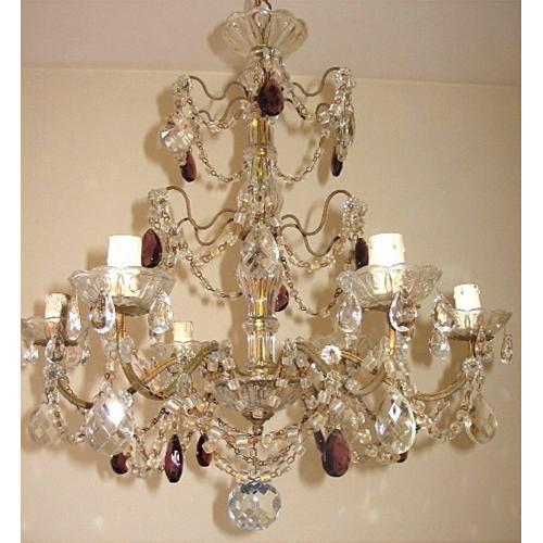 This is an exquisite chandelier from Italy, whose elegant design and sparkling amethyst pendants immediately caught our attention. The chandelier has six nicely curved branches, three tiers of amethyst pendants and strands of gorgeous "macaroni" beads between each branch. Please also note the sparkling faceted ball at the bottom. This chandelier is sure to add a touch of Italian flair to your fine interior! It dates from circa 1930 and measures approximately 21" x 20".