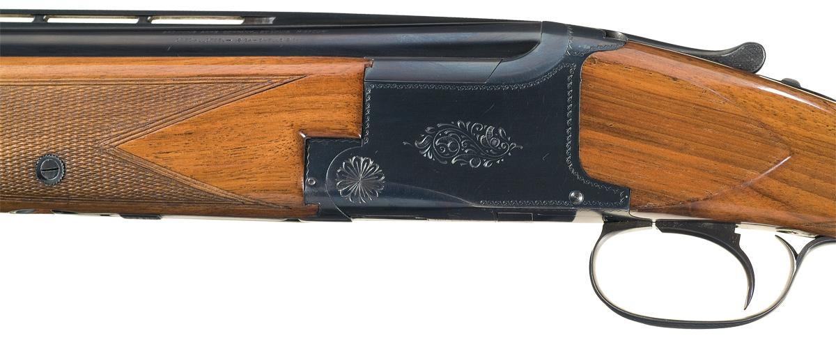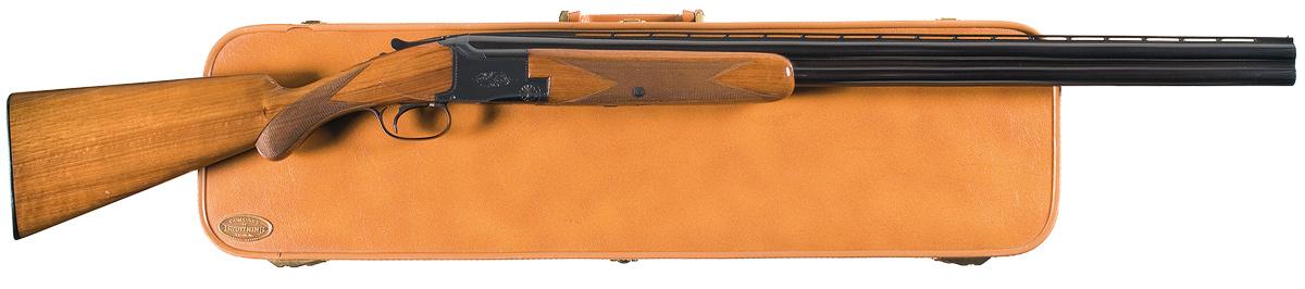Manufactured in Belgium in 1951. Single bead sight on a vent rib with chambers marked 2 3/4" and chokes marked full/improved modified. The action features a light floral engraving with a tang mounted safety/barrel selector and a single trigger. Checkered forearm and round knob pistol grip stock with Browning buttplate. Length of pull is 14 1/4". Complete with a Browning takedown case.