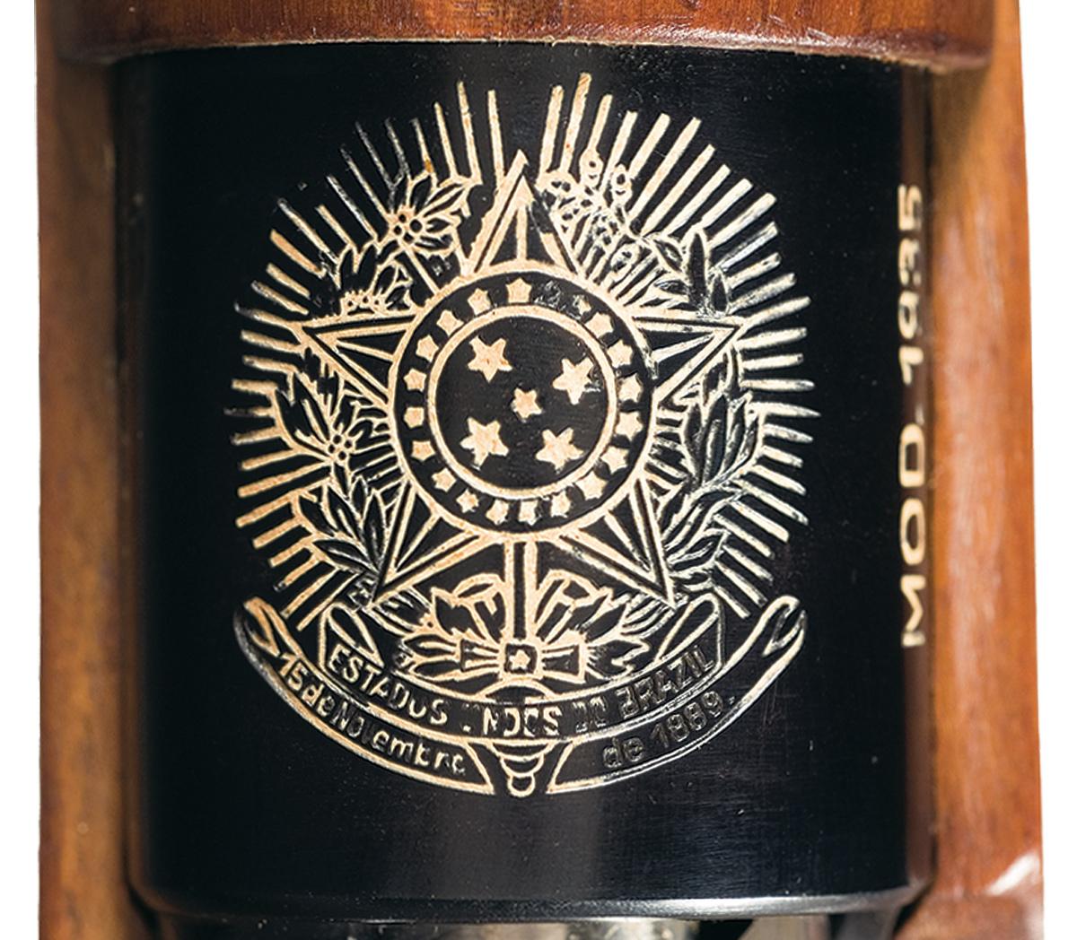 This is an unissued example of one of the last contract rifles manufactured by the Mauser factory before WWII. These rifles were manufactured under contract for the Government of Brazil and are patterned after the WWI Gewehr rifles except they have the improved tangent rear sight, wide middle barrel band and the wooden handguard extends to the receiver ring. The top of the receiver is marked with the large Brazilian crest, the right side is marked "MOD. 1935" and the left side receiver wall is marked "MAUSER-WERKE A.G.OBERNDORF A/N." It has the traditional prewar Crown over "B", "U", " C" and "N" proofs and the left side of the receiver ring and the small Mauser banner on the top rear of the receiver. Some of the small components are marked with the partial serial number "32" as well as the complete number on the bolt handle and a crown / "B" and "U" proofmark. The front sight is a dovetailed raised ramp inverted "v" and the rear tangent sight is graduated to 2,000 meters and the bolt assembly and buttplate are finished bright. Complete with matching bayonet, scabbard, a leather sling, cross hatch leather sling, muzzle/front sight cover and the original test target numbered to the gun.