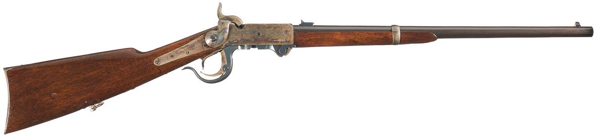 This is an unissued original example of a Burnside Model 1864 Civil War carbine. This carbine has the distinctive guide screw in the right side of the receiver and the Model 1864 marking that distinguishes the 5th Model Carbines from earlier Burnside Carbines. The carbine has a dull blue finish on the barrel and bright blue tangs, trigger guard, action lever, lever catch and sights. The barrel band, frame, hammer, lock plate, breechblock and buttplate are casehardened. The stock and forearm are oil-finished black walnut. The barrel is fitted with a pinched blade front sight and two-leaf, folding rear sight graduated to 500 yards. A sling bar and ring are located on the left side of the frame. The top of the barrel is marked: "CAST STEEL 1864". The top of the frame is marked: "BURNSIDE PATENT / MODEL OF 1864" over the serial number, the top of the breechblock is marked with the matching serial number and the lock is marked "BURNSIDE RIFLE CO. / PROVIDENCE RI." behind the hammer. Small, single initial sub-inspector's marks ("W", "B" and "P") are stamped on many components. Two boxed script inspector's cartouches, "STB" and "RKW", are stamped on the left side of the stock wrist. Approximately 43,000 5th Model Burnside Carbines were procured by the U.S. Army from 1863-65. The Burnside carbine was one of larger production Federal cavalry weapons.