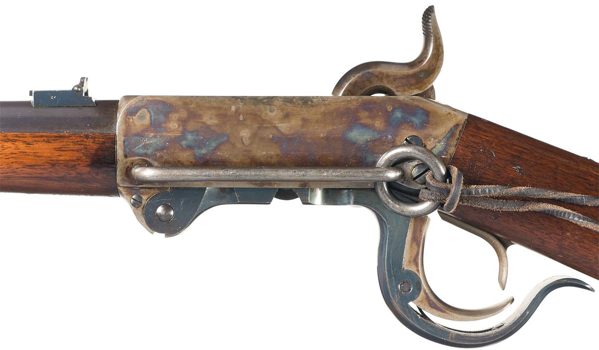 Condition: Excellent plus. The carbine retains 98% of the original blue on the barrel and 99% vivid original case colors on the receiver, lock, hammer and lever catch. The stock and forearm remain excellent with a moderate dent on the right side of the stock, a few small gouges on the left side of the forearm and overall a few minor dents and dings. The inspector's stamps on the stock wrist are extremely crisp. The markings are crisp and clear. Mechanically excellent. This is an exceptional unissued example of an important Federal Civil War cavalry carbine.